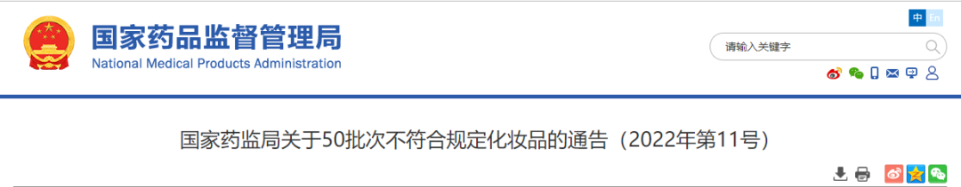 国家药监局:关于 50 批次不符合规定化妆品的通告