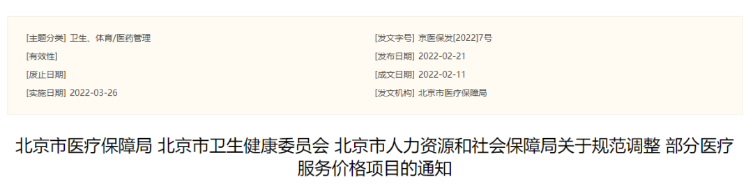 北京市医保局会同市卫生健康委、市人力社保局印发《关于规范调整部分医疗服务价格项目的通知》(京医保发〔2022〕7 号)