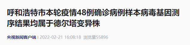 自治区和呼和浩特市疾控中心已完成本轮疫情 48 例确诊病例样本的病毒基因测序,测序结果经自治区疾控中心和中国疾控中心进行比对,比对结果均属于德尔塔变异株,在国内本土病例和输入病例数据库中均未找到同源性较高的序列。(来源:央视新闻)