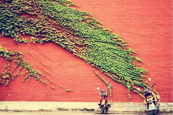 这块红色的砖厂墙面上爬满了爬山虎,红色与绿色的撞色原来也很好看。