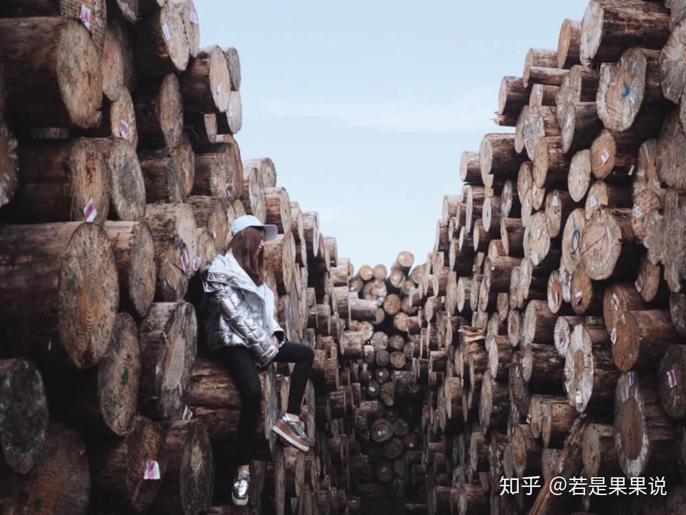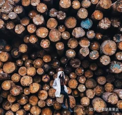 这里是重庆第二大港——大渡口茄子溪港口的木材集散点。这里之所以成为意外的旅拍地,是因为这些参差堆叠的原木,就像一个360度无死角的棚拍置景。