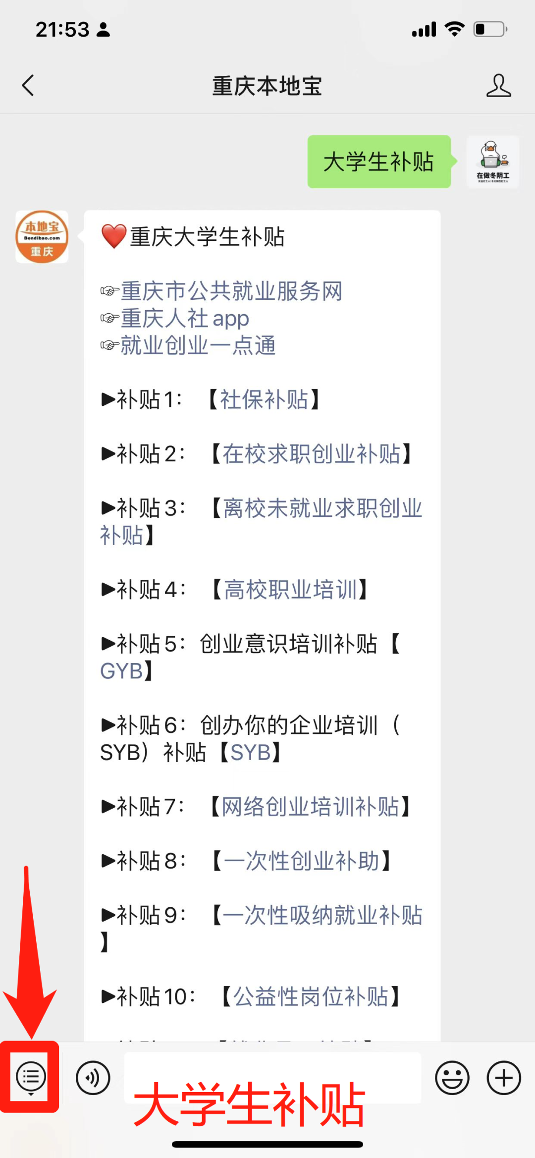 点击 去年毕业的小伙伴注意啦 如果你还没有就业 符合条件你可以领一笔钱: 离校未就业求职创业补贴 ↓↓↓ 离校1年内我市户籍登记失业的下列高校毕业生: 低保家庭成员; 零就业家庭成员; 残疾人家庭成员; 本人身有残疾; 特困救助供养; 脱贫人口。 划重点:重庆市户籍 进行过失业登记 👉不知道怎么登记失业的,可以在重庆本地宝微信对话框回复【失业】,获取失业登记入口及办理流程: 每人一次性补贴500元 不得重复享受 个人向任一街道 (乡镇) 公共就业创业服务机构申请。 图源:重庆就业网 看到这儿 不少小伙伴们说 还有别的大学生补贴吗? 当然有 还有【在校求职创业补贴】 【就业见习补贴】 【社保补贴】 【一次性创业补贴】 【公益性岗位补贴】 等等等一系列补贴 大家可以长按识别下方二维码 关注“重庆本地宝” 进入微信公众号 输入“大学生补贴” 即可获取 相关补贴申请入口及申领流程 -END-蓝字关注 回复“元宵”获取重庆元宵活动推荐