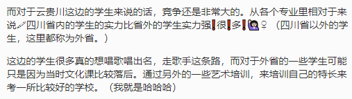 有川音的学生在网上分享经验时认为,四川省内考上川音流行音乐学院的难度比外省艺术生要大很多,感觉“这边的学生很多真的想唱歌出名、走歌手这条路”,而不只是随便考考艺术院校。