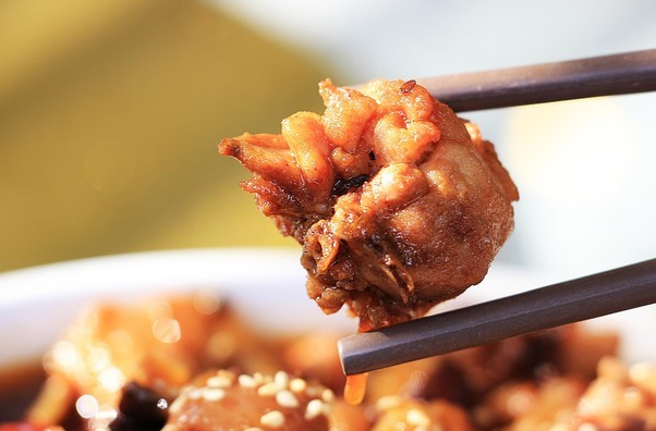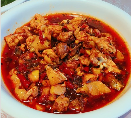南山泉水鸡的原料是少量的泡椒、还有少量的泡椒、再加上一点豆瓣、再加上少量的香菇花椒泉水、再加上一些料酒、味精,还有胡椒白糖之类的佐料。一口下去鲜香辣爽!超级下饭泉水鸡一般是一鸡三吃:泉水鸡,鸡血旺,炒鸡杂,真正的大块吃肉,香辣无比。