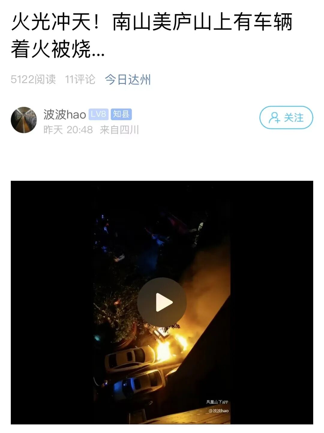 南山美庐山上有车辆着火被烧...””