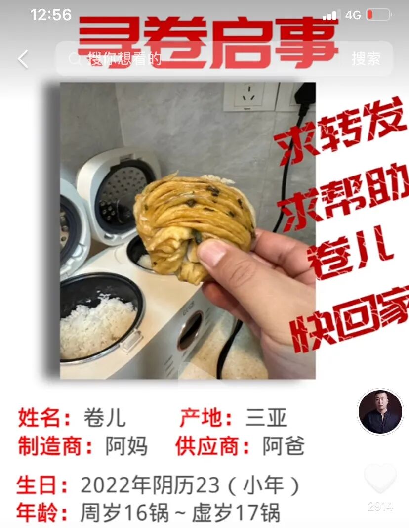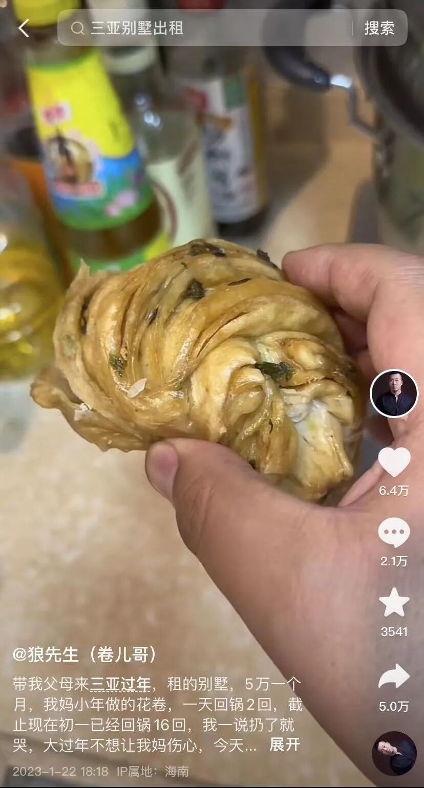 “带父母来三亚过年。租的别墅,5万元一个月。我妈小年做的花卷,一天回锅两回,截至初一已经回锅16回。我一说扔她就哭,今天又回锅了,我爸实在咬不动了……” 正月初一,抖音用户“狼先生(卷儿哥)”发布一则视频,吐槽母亲非要自己吃已经回锅16次的花卷:农历小年蒸的,每天回锅两次,一共回锅蒸了16次,最后都是硬的,敲起来邦邦响也舍不得扔,必须和剩菜、调料一起带回东北。 视频发出后迅速引发网友热议,截至今天,该视频点赞数6.4万,留言2.1万。网友调侃:“住5万元一月的房子,吃回锅16次的花卷”“这花卷再回锅一次,都能拿着防身了”…… 01 租住5万元一月别墅的儿子, 遭遇打包17个包裹回家的父母 “卷儿哥”本名李红刚,今年37岁,来自辽宁辽阳,过年期间带着全家到三亚度假,后来又租住位于陵水清水湾的果岭牧歌别墅,一个月5万元。知道这次度假一共花了20多万元后,李爸爸一连抽了半盒烟,李妈妈生气躺了一天。 1月23日,李红刚一家计划从三亚出发,到海口乘坐飞机回东北,然而父母舍不得在三亚买的东西,就连用了一半的牙膏、剩一半的火锅底料都要打包带走。李妈妈还用胶带将新买的扫帚和簸箕绑在背上,准备 “人肉搬运”。 李红刚介绍,当天本来定好商务车去机场,结果全家17个包裹,实在装不下,导致飞机没赶上,还损失了几千元。“东西实在太多,我另外租了一辆车运走5个大包裹。”最后,一家人被迫重新买票,拖着12个包裹,从海口坐火车回东北。 02 曾抱怨回锅16次的花卷, 帮助“涨粉”成最好的新年礼物 “我是来看花卷的” “花卷呢?我这么硬的花卷呢?” …… 除了李红刚一家,回锅16次的花卷也备受网友关注。 1月26日,李红刚在抖音平台发布一则《寻卷启事》视频称,求转发帮助卷儿快回家。原来,1月23日,一家人到达海口火车站后,李妈妈想找出花卷来吃,结果发现不见了。“我妈抱怨是我爸给整丢的,我爸说不是他丢的,我猜行李太多遗失了,现在粉丝追着想看卷儿……” “我没想到自己能火,就因为这些花卷,现在抖音粉丝都有8万多。”李红刚表示,以前特别羡慕别人在抖音有许多粉丝,这回“涨粉”也是最好的新年礼物。 “三亚是我们北方人的度假天堂,我爸妈都很喜欢三亚,他们打算下一个冬天到三亚的养老公寓度假。”李红刚说,春节期间到三亚亚特兰蒂斯酒店待了1个多月,后来才到陵水租房,回东北后感觉不习惯,天气太干了。 来源:三亚传媒融媒体记者卢巨波 孙琦,图片截图自狼先生视频,视频来源抖音ID:狼先生(卷儿哥) 编辑:李丹丹 终审:萧真 点分享 点收藏 点点赞 点在看