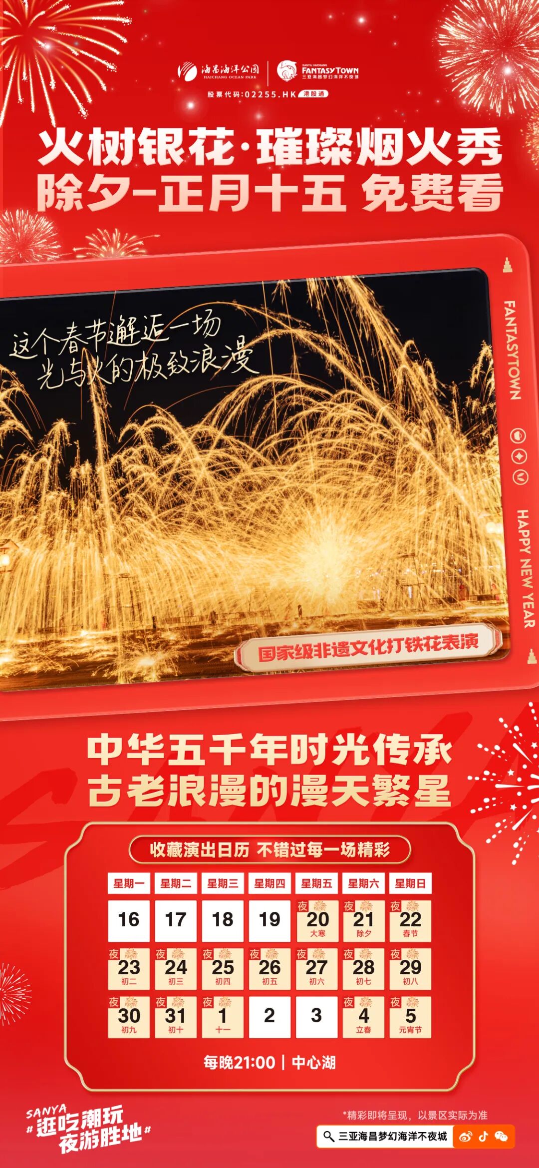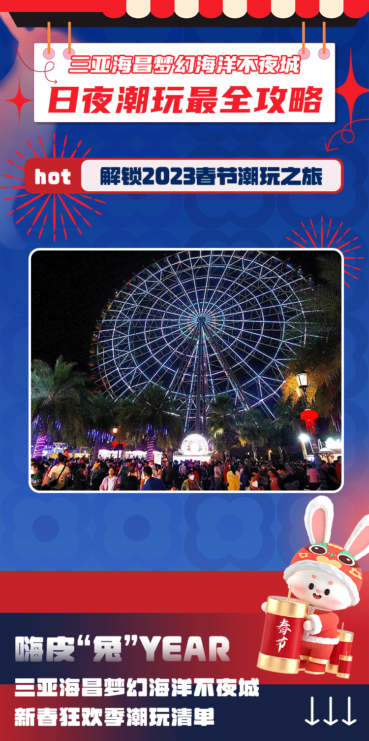 z 还没想好春节去哪玩的小伙伴们 不用再纠结了! 海昌梦幻海洋不夜城四周年 重磅开启的新春狂欢季 满足海岛过年外出游玩的所有需求 一键式开启新春游玩模式 在三亚这样过春节 那才够味~ 过年当然不能少了烟火大赏 不夜城精心为你准备的 国家级非遗文化“打铁花表演” 长达十五天的璀璨燃放 让新春夜空火热不断! 璀璨烟火的盛放浪漫 伴随着小孩、家人的 欢笑与热闹 将新春喜气的氛围推向高潮! 过年要有年味 那必须要来场绝美的烟火秀呀~ 用1600摄氏度铁水 挥洒出属于新春的火热~ 会玩的三亚人都在不夜城 与烟火浪漫相遇啦! 你还在等什么呢~ 收好烟火秀时间表 新年和家人一起来观赏璀璨烟火吧~ 当燃艺术节新春精彩再续 100余场主题演艺表演免费看 点燃新春佳节愉快氛围 欢乐嘉年华巡游 与童话人物一起欢度春节 互动、舞蹈...好不快活~ 快来和小丑、公主一起打卡新春吧! 欢乐剧场 亲子欢乐聚集地 春节就和家人一起放松一下吧~ 机车派对 过新年,潮流不止 机车派对带你潮玩兔年! 黎族打柴舞 海岛传统民族特色 让新春随着竹筒的节拍跳动 听哒哒哒的新春声音~ 国潮快闪 喜迎瑞兔新春 当然少不了年味加持啦! 传统舞狮让新春火热开燥~ 夜光花车巡游 新春游街演艺 让春节火热氛围拉满 与各类玩偶一起享受新春狂欢吧! 还有更多春节演艺惊喜等你揭晓 收好时间表 各类新春演艺不容错过哦~ 过年可不能少了娱乐项目 不夜城十六大网红游乐 让新春陪伴在欢笑中赓续~ 摩天轮、旋转木马 是新春浪漫首选 与爱的人在这浪漫处 享花好月圆夜 碰碰车、鲨鱼过山车 是亲子共乐选项 可以增添与孩子的新年欢乐记忆哦~ 勇敢者转盘、高空飞翔、海盗船 是“冒险者”的新春最爱 在尖叫声中过年 也算是另一种驱赶年兽的方式吧! 新春Fun不停 这波新春优惠福利赶紧冲哦! 在三亚过年 千万不能错过海鲜佳肴哦! 不夜城海鲜美食狂欢节 轻松get海洋美味 山珍海味与热舞狂欢同在 让眼睛和味蕾 一起共享佳节氛围! 还有许多网红人气餐厅 让你新年吃到爽! 海棠宫 纯正的海南美味与传统餐桌交融 过年聚餐的必选之项 快和家人一起来这共品海岛的新春味道吧~ 蒂铂海底餐厅 情侣度假餐厅的打卡点 与海洋共度新年 在“海底”大快朵颐! 炭火亭烧烤 美景、烧烤、好酒的三重美好加持 在良辰美景和美味佳肴中 眼睛和味蕾可以一起过大年啦! 孟加拉寻宝餐厅 春节当然要吃些不一样的啦 异域风情与高奢的碰撞 想必有品位的人 都会来这里过春节吧! 日式铁板烧 户外露天厨房 让厨艺和美食看得见 喜欢日式风味的小伙伴 春节就到这打卡吧~ 码头故事 海鲜与火锅的绝妙搭配 让海鲜在滚烫的汤中尽显鲜美 在海岛过年吃海鲜火锅 简直不要太完美了~ 春节轻松享美食 不夜城美食优惠购不停! 新春佳节肯定要拍照留念的! 不夜城开设的花样打卡点 新春花样开拍~ 有绝美的三亚之眼·浪漫取景框 还有兔年国潮旅拍 光影幻彩墙、海昌七萌墙... 就等你春节来拍照打卡啦~ 过年来不夜城打卡拍照 让新春美好的回忆 印在这些照片里 与你一起留足兔年吧~ 每一次过春节 都少不了孩童们的聚集玩闹 海南首家奥特能量站 空降三亚海昌梦幻海洋不夜城 集美食与购物一体 无论逛到哪里 都能购到“童趣”吃到“童趣”~ 还有两大爆品限定发售 “迪迦光之巨人系列爆米花桶” “奥特雪糕” 好吃又好玩 随时随地补充能量! 新春潮流兔young市集也是不能错过滴~ 各种小摊层见叠出 让新春欢购不断! 海岛趣玩、特色小吃... 你可以享受关于市集里的 一切丰富 快来这里为新春的夜晚添一把 人潮拥挤的火热吧! 【新春惊喜彩蛋】 十六年经典魔域IP新作《魔域手游2》 携手海昌海洋公园 举办「巅峰狂欢夜」主题庆典活动 价值百万的礼品疯狂送 还有特别定制《魔域手游2》 专属主题摩天轮包厢~ 参与活动抽奖可有机会获得: ①三亚海昌梦幻海洋不夜城-摩天轮成人票 ②上海海昌海洋公园-成人门票 ③1万张海昌海洋公园门票优惠券 参与方式: 扫描上方二维码进入活动界面,点击活动页面中的「立即抽奖」按钮,登录页面,便可轻松获得一张奖券,参与「更多奖券」内提示的活动,还能拿到额外奖券,大幅提升中奖率。 春节逛吃潮玩之地 当然选三亚梦幻不夜城啦~ 在新春狂欢季的赤热加持下 开启瑞兔新春 简直不要太热闹! 快和家人一起开启春节狂欢之旅吧! 【园区信息】 - 营业时间 - 10:00-24:00 游乐设备12:00-23:00 火树银花·璀璨烟火秀21:00 夜光花车巡游22:00 *以上信息仅供参考,具体以景区实际为准 - 景区咨询电话 - 400-601-6699 - 景区地址 - 海南省三亚市海棠区海岸大道168号 (海棠广场对面)