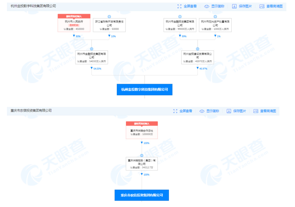 根据公告显示,杭金数科、重庆市农信投资集团,都将参与到蚂蚁消金的增资方案。值得注意的是,杭金数科来自杭州市政府旗下,重庆市农信投资集团则是重庆供销合作社旗下。
