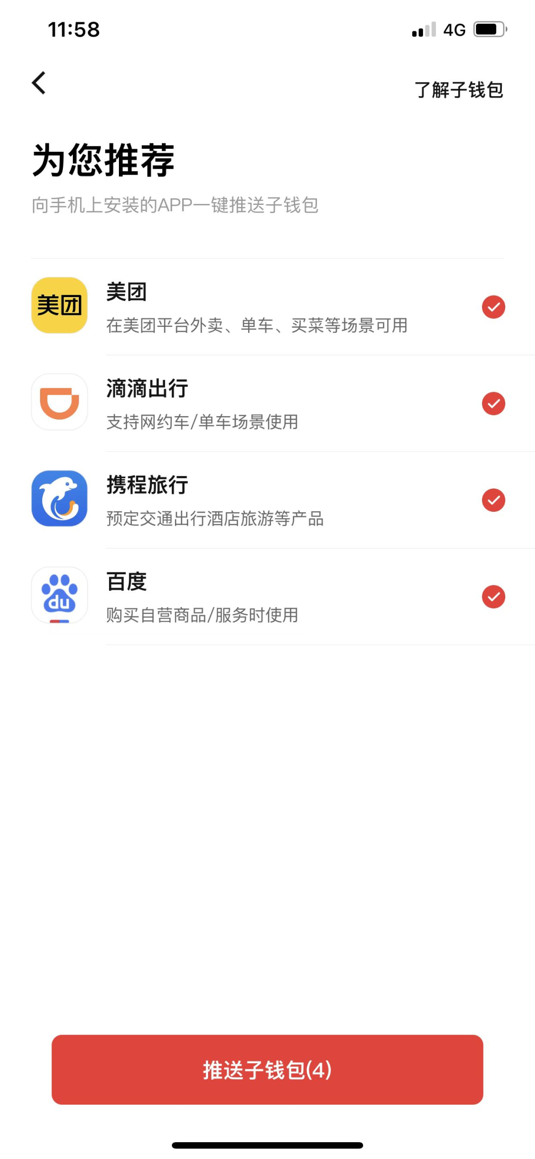 按照要求开通数字钱包,随后通过添加银行卡等方式进行实名认证,将匿名钱包升级为实名钱包,选择向手机上安装的APP一键推送子钱包,勾选之后可以看到“我的钱包”里面有同一个手机号注册的其他APP。