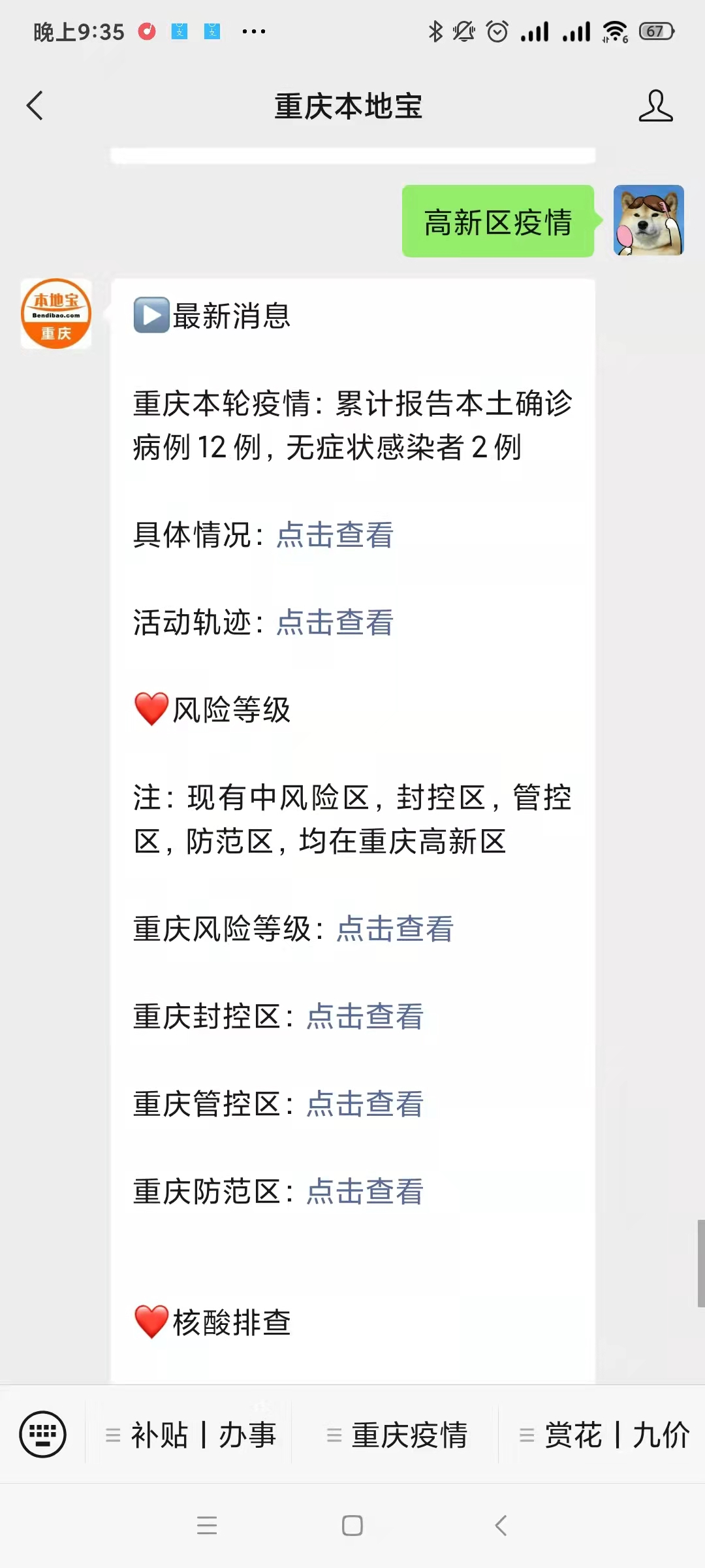 点击 3月13日,重庆市发布了 新冠肺炎疫情防控工作新闻发布会(第101场) 会上通报了重庆疫情情况 重庆高新技术产业开发区管理委员会 发布了2022年1号和2号通告 请大家配合好防疫工作 同时做好个人防护 重庆最新疫情情况 3月12日12时至3月13日17时,重庆市新增新冠肺炎本土确诊病例9例、本土无症状感染者2例。 本次疫情发生以来,累计报告本土确诊病例12例(其中普通型2例,轻型10例)、本土无症状感染者2例,均为重庆城市管理职业学院学生。 病例1-8和无症状感染者1相关情况今日8时已在市卫生健康委官网公布。(相关情况和活动轨迹详见【重庆本地宝】今日第二条推文) 病例9-11为病例2的密接,病例12与病例3住同一楼栋,无症状感染者2在重点风险人群中检测发现。 所有患者均已在市公共卫生医疗救治中心接受隔离治疗或隔离医学观察,救治工作正在有序开展,患者总体情况平稳。 摄图网ID:401676709 重庆最新核酸检测结果 截至3月13日17时,在渝密接、次密接已核酸检测1497人,已出结果1475人;重点风险人员核酸检测累计采样28.1万人次,已出结果19万人次,除已公布的确诊病例和无症状感染者外,其余均为阴性。 采集环境样本83份,已出结果83份,均为阴性。 重庆高新技术产业的开发区管理委员会 发布了2022年1号和2号通告 重庆高新区新型冠状病毒肺炎疫情防控指挥部通告(2022年第1号) 根据国家和市关于应对新型冠状病毒肺炎疫情分区分级防控工作要求,经市疫情防控指挥部同意,自2022年3月13日19时起,将重庆城市管理职业学院(大学城南二路151号)学生宿舍B栋、E栋、G栋区域调整为中风险地区。 以上区域管控措施按相关防疫规定执行。后续将根据疫情防控形势变化适时调整风险等级。请广大群众增强防疫意识、遵守防疫要求、配合防疫管理,做好个人防护,保护好自己和家人的健康,如出现发热、咳嗽等急性呼吸道症状,请及时到定点医疗机构发热门诊就诊,并向社区和单位报告。 特此通告。 重庆高新区新型冠状病毒肺炎疫情防控指挥部 2022年3月13日 摄图网ID:401896790 重庆高新区新型冠状病毒肺炎疫情防控指挥部通告(2022年第2号) 根据国务院联防联控机制有关要求及重庆高新区疫情防控指挥部和市级专家综合评估,高新区有关区域划定封控区、管控区、防范区: 一、封控区 重庆城市管理职业学院校园(大学城南二路151号),重庆城市管理职业学院东侧商业门面(大学城中路临1号)、北侧商业门面(大学城南二路153号附1号至17号),重庆城市管理职业学院家属区逸雅苑小区(大学城南二路155号)。 封控区内实行“区域封闭、足不出户、服务上门”管控措施,因就医等确需外出人员由社区安排专人专车进行闭环管理。 二、管控区 高新区康居西城一组团(康城路4号),高新区康居西城二组团(康城南路3号),高新区协信城立方西区(大学城中路2、4、6号),高新区恒大未来城四街区(大学城中路3号),高新区恒大未来城七街区(智贤路380号),高新区熙街商业区(景苑路8号、12号),高新区西科公寓(西科大道22号)。 管控区内实行“人不出区、严禁聚集”的管控措施,管控区内人员原则上居家健康监测,对确需出入小区人员严格落实查证、验码、测温、登记的规定。 三、防范区 高新区曾家镇、西永街道、虎溪街道、香炉山街道除上述封控区、管控区外的区域。 防范区内实行“强化社会面管控,严格限制人员聚集”的管控措施,避免人员流动。 以上措施自2022年3月13日19时起执行,后续将根据疫情防控形势变化及时调整。 特此通告。 重庆高新区新型冠状病毒肺炎疫情防控指挥部 2022年3月13日 摄图网ID:401680648 住重庆城市管理职业学院 附近的部分居民 渝康码已经无法显示 需要配合做好自我观察和核酸检测 图源:我们没有翅膀(已授权) 后续新消息 关注“重庆本地宝” 进入微信对话框 输入“高新区疫情”获取 即可获取 重庆疫情最新消息 大家近期要时刻关注疫情消息 -END- 回复【九价】获取重庆九价疫苗最新消息 回复【赏花】获取重庆春季赏花攻略 回复【疫情】获取重庆疫情最新消息 回复【进重庆】获取进出重庆是否要隔离及核酸 回复【加强针】获取加强针到苗消息(每天更) ▌声明:本文由重庆本地宝编辑整理发布,转载请注明 ▌素材来源:重庆高新技术产业的开发区管理委员会、重庆发布、重庆市疾控中心、重庆市卫生健康委员会、重庆本地宝整理发布 ▌图片来源:图虫网、摄图网(已获授权)、我们没有翅膀(已授权) ▌编辑:欠费、乐多 ▌关于版权:重庆本地宝尊重版权,如有侵权,请联系删除 ▌商务合作:电话 400-9999-087 QQ 4009999087 ▼点击“阅读原文”,即可获取重庆最新隔离/核酸政策!蓝字关注 回复“疫情”获取重庆疫情消息