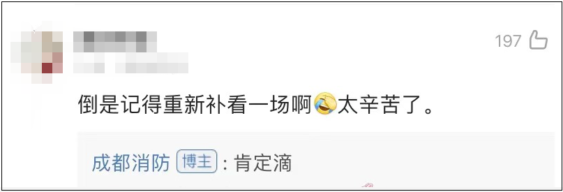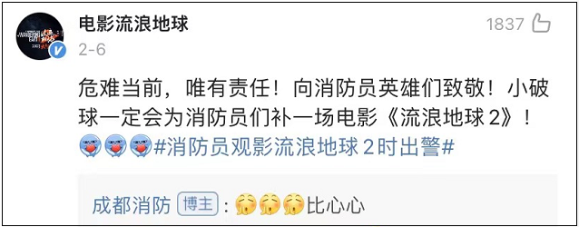 一个有温度、有深度、有态度的团团 2月10月 #吴京要为消防员补上没看完的电影# 话题登上热搜 事情的来龙去脉 还要从一场电影说起 2月6日 @电影流浪地球 关注到此事 在微博上喊话: 危难当前,唯有责任! 向消防员英雄们致敬! 小破球一定会为消防员们 补一场电影《流浪地球2》! 据了解 流浪地球的主演之一吴京 看完这个视频后对 成都消防表示致敬 答应给成都消防的消防员们补票 称“再请他们看一遍” 2月10日 @成都消防 更新了后续 电影票安排上了! “感谢吴京和球球 为消防员安排的电影票 待会儿影院见” 据央企头条报道,《流浪地球》系列导演郭帆谈到了拍摄第二部的灵感来源于一张照片:一位消防员逆行冲进火灾现场救人。“这个消防员是一位普通的年轻人,他的选择让他成为了英雄。” 对此,@电影流浪地球 表示:每一个义无反顾向前冲的背影,都是平凡而又伟大的每一个人的缩影。向你们致敬! “青春志愿 ● 品质广安” | 关注森林湿地·共护绿水青山——广安区西部计划志愿者在行动! 来 源:天府新青年 编 辑:吴云春 审 核:赵佳佳、温明朗、张卡丽 征集令 “一支穿云箭,千军万马来相见”。青春广安微信征稿啦~你的青春故事、你的工作思考、你的生活随感,时事评述、青年动态、所见所闻等,欢迎你的踊跃来稿!我在这里等着你,见证我们青春的记忆! 征稿邮箱:gqtgaqw@163.com