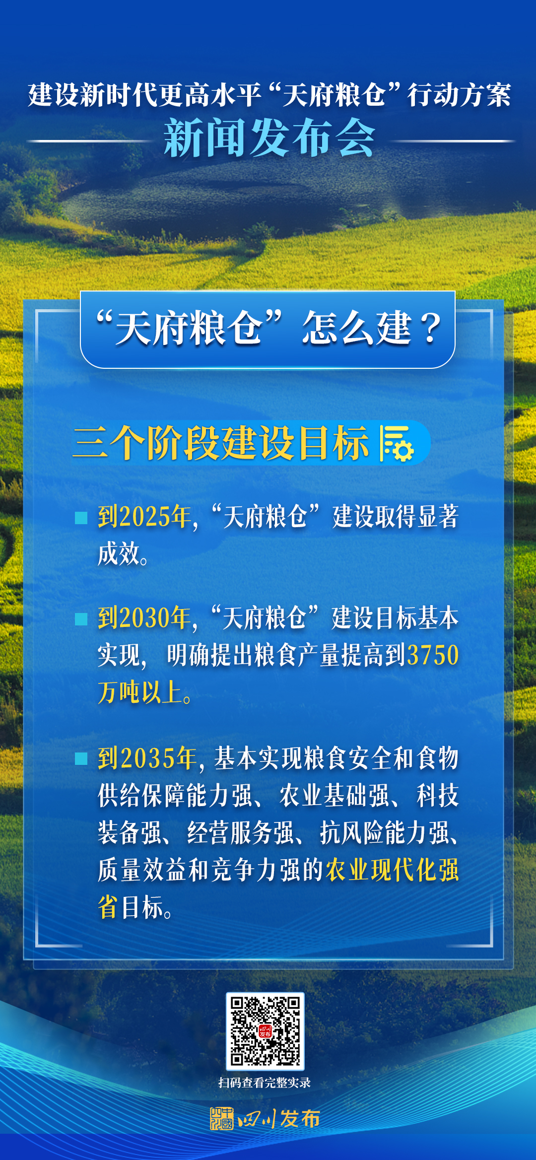 省农业农村厅党组书记、厅长徐芝文介绍,《行动方案》提出三大阶段建设目标。第一阶段,到2025年“天府粮仓”建设取得显著成效;第二阶段,到2030年“天府粮仓”建设目标基本实现,明确提出粮食产量提高到3750万吨以上、“菜篮子”产品生产基本实现现代化、耕地保有量和永久基本农田保护面积超额完成国家下达目标任务、永久基本农田基本建成高标准农田等定量定性的目标;第三阶段,到2035年基本实现粮食安全和食物供给保障能力强、农业基础强、科技装备强、经营服务强、抗风险能力强、质量效益和竞争力强的农业现代化强省目标。