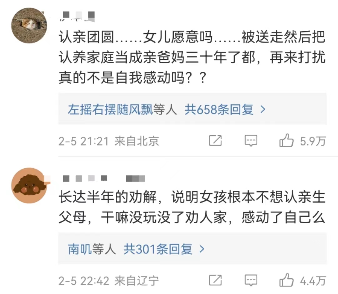 “失悔寻女30年,元宵节终于认亲团圆”这一标题,再配上团圆的照片,本该是大众喜闻乐见的美满结局,但这一次,却在网上引起了巨大争议。