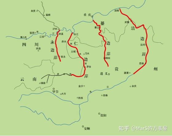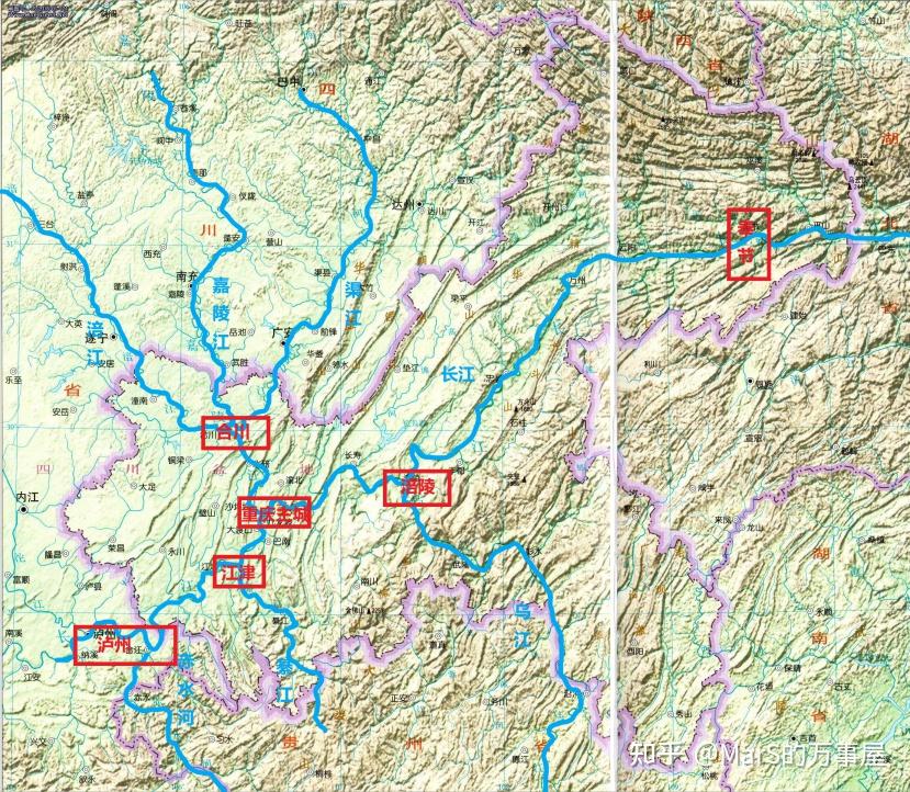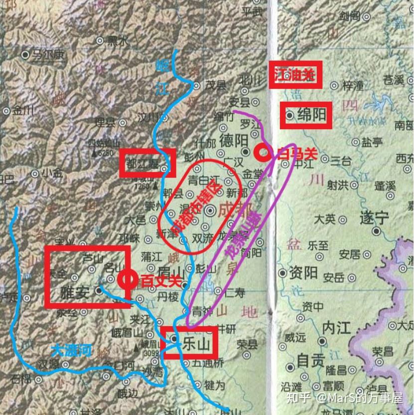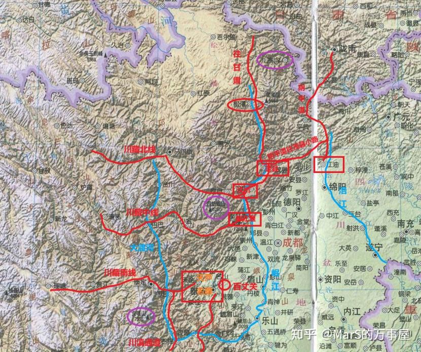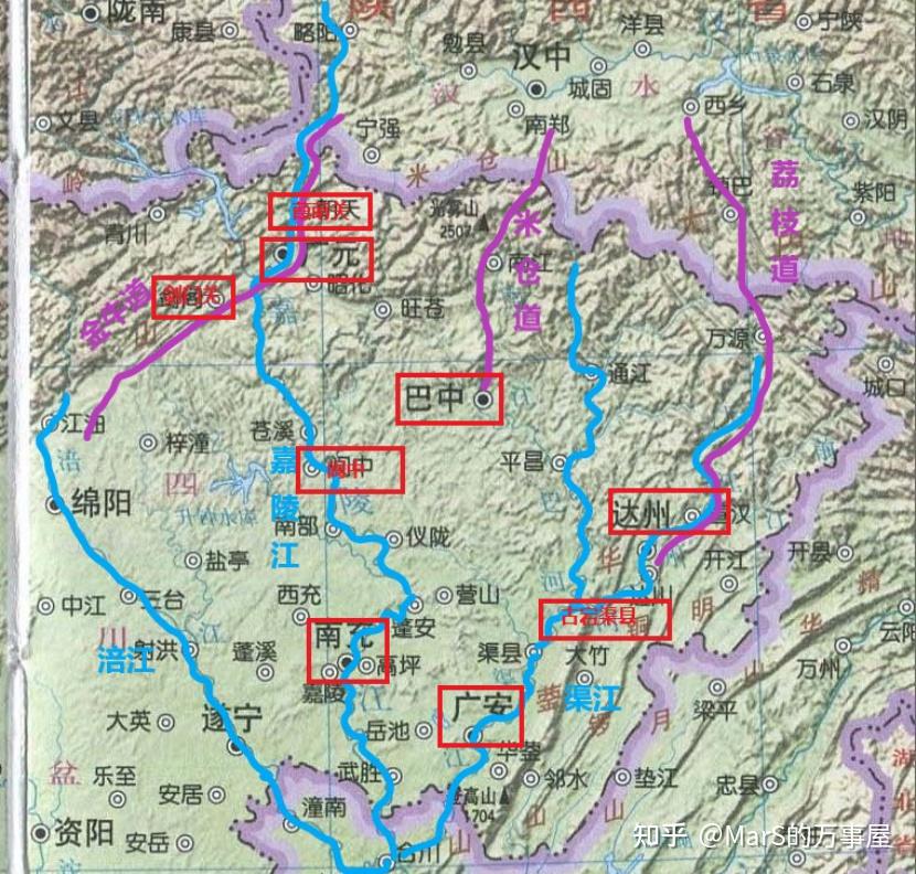 红色为标记的水路有关的重镇,紫色为将四川盆地和周边地形区隔开的山区,不是一般的山区,都是无法通行的大山。其中有部分河流贯穿了这些山区,这些河流也构成了能够通行的河谷,进而在这些河谷上也形成了进出四川盆地的关隘。