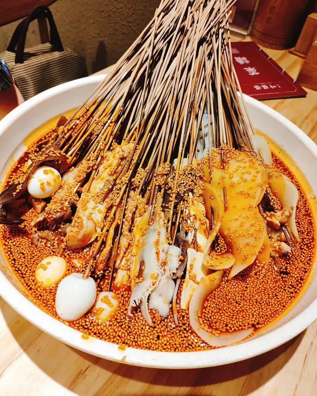 “钵钵”是瓦罐,在瓦罐中插满竹签,吃起来非常方便。钵钵鸡一般都是荤素结合,搭配上秘制的酱料,好吃到停不下来!