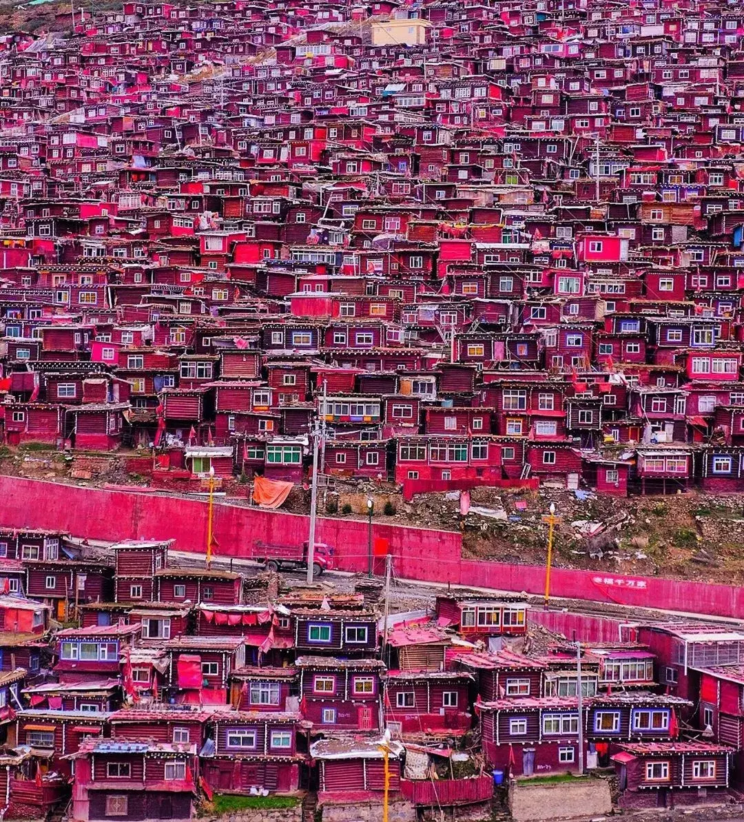 色达是信仰的乌托邦,很多人来了,就不想走了。这里有世界最大的佛学院——五明佛学院,色达最高的建筑——坛城,还有成千上万的红色僧舍、红色经幡、红色的虔诚藏民。