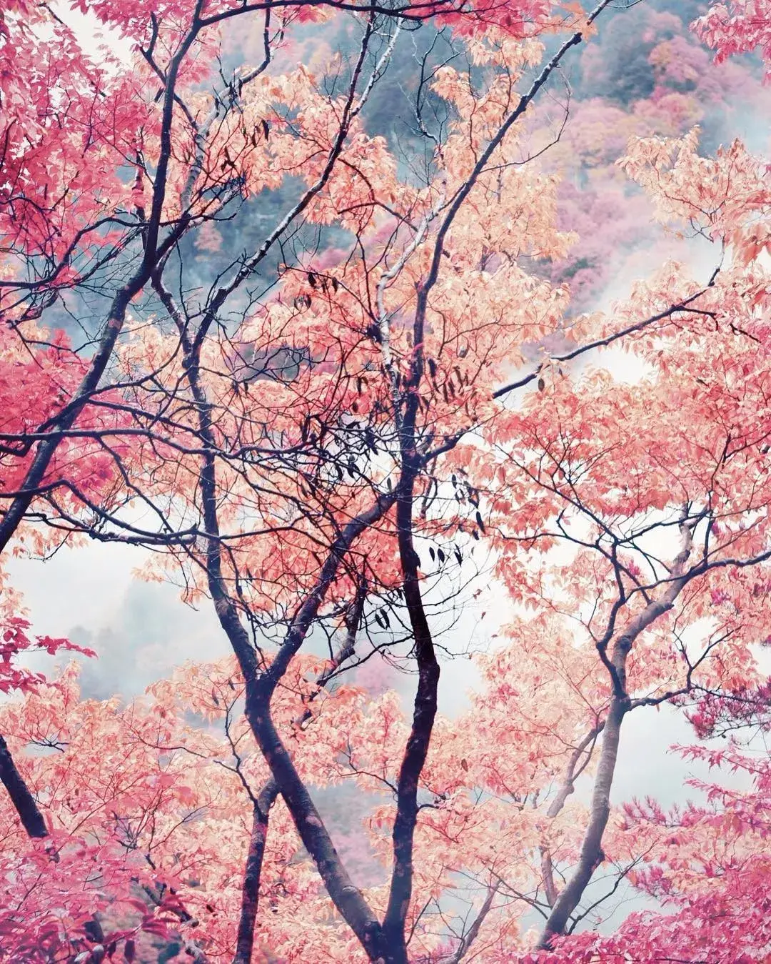 遍山的红叶,层林浸染,色彩斑斓,加上常年烟雾缭绕的山头,放眼望去,完全是一场视觉盛宴,如仙境般,美到窒息。