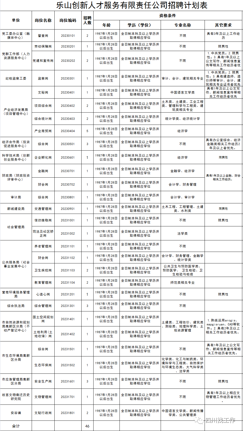 本次面向社会公开招聘46名劳务派遣工作人员,用人单位、岗位及招聘名额和岗位所要求的具体对象、范围、条件详见《乐山创新人才服务有限责任公司招聘计划表》(以下简称《招聘计划表》,附件)。