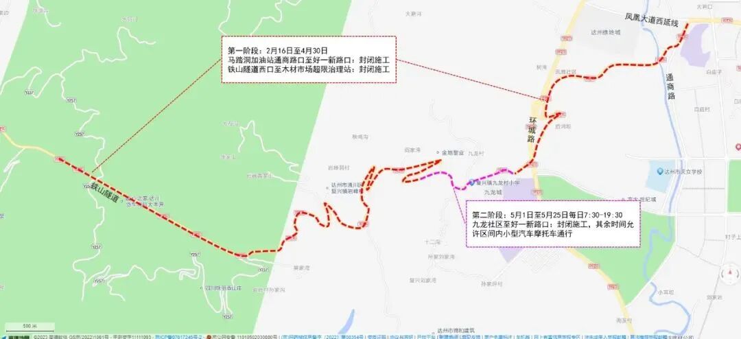 达州市交通运输局 达州市公安局 关于国道G210、G542达州市主城区 部分路段大修期间 实施临时交通管制的通告 二、国道G542施工路段临时交通管制措施 (一)第一阶段(2023年2月16日9时至2023年4月30日24时)对马踏洞加油站通商路口至环城好一新路口路段(K344+000—K346+400)、铁山隧道西口至木材市场超限治理站路段(K335+000—K342+000)实施封闭施工。 (二)第二阶段(5月1日0时至5月25日24时),每日7时30分至19时30分对九龙社区至环城好一新路口路段(K342+000—K344+000),实施封闭施工,其余时段允许区间内小型汽车、二三轮车通行。 (三)临时占道施工期间,往返金窝至达州城区方向汽车请绕行S26营达高速铁山至管村路段。 三、其他规定临时交通管制期间,请过往车辆、行人服从施工现场管理人员管理指挥,借用施工路段通行的车辆、行人须在施工管理人员的引导下安全、有序通行,不得在施工区域逗留。四、法律责任凡违反本《通告》者,公安机关交通管理部门将依照《中华人民共和国道路交通安全法》及其实施条例、《四川省〈中华人民共和国道路交通安全法〉实施办法》的有关规定实施处罚。特此通告。 达州市交通运输局 达州市公安局 2023年2月13日 来源:达州公安交警 编辑:潘美怜 责编:龚清华 张蔓藜 总编:李培询