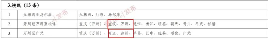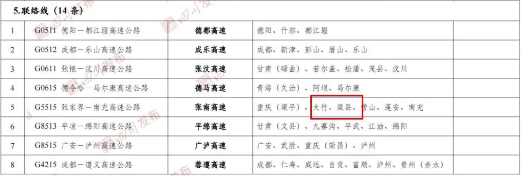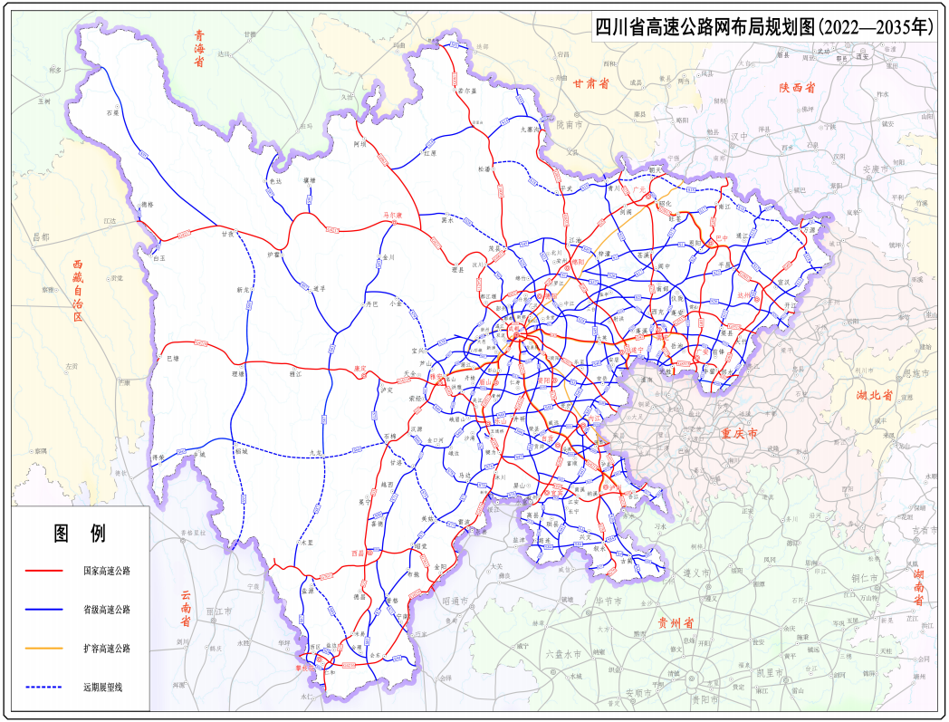 达州全记录!不定期送福利! 四川一批新高速线路出炉啦~ 20条成都放射线 13条纵线、13条横线 4条环线、44条联络线 18个地级城市绕城环线 ...... 快看看达州有哪些? 有没有你期待中的“那条线” ▲ 四川省高速公路网布局规划图(2022-2035年) 规划新增这些高速公路 强化主轴 增设高速公路4条,包括:安居至潼南、大英至潼南、安岳至荣昌、自贡至永川。 密实两翼 增设高速公路13条,包括:达州至万州、垫江经邻水至合川、南充至合川、合江至荣昌、万源至开州、万源至南江、南江经朝天至青川、青川至文县、平昌至仪陇、蓬安至岳池、剑阁至阆中、南部至绵阳、珙县至盐津(串丝)。 畅通三带 增设高速公路10条,包括:北川至安州、新都至德阳、大邑至宝兴、芦山至名山、洪雅支线、乐山机场高速公路、西充至射洪、米易至会理、盐边经西区至仁和、攀枝花机场高速公路。 联动三州 增设高速公路6条,包括:九寨沟至迭部、平武至松潘、甘洛经美姑至雷波、雷波至永善、石棉经九龙至稻城、米易至盐源。 将一批沿线人口稀少、地形条件特别困难、交通需求较小地区的路线规划设置为远期展望线,包括:开州经万源至青川、平武至松潘、茂县至黑水、小金至宝兴、甘孜至新龙、九龙至木里、稻城至香格里拉、石棉经九龙至稻城、石棉经甘洛至雷波、米易至盐源。 绕城环线,达州也将拥有 规划设置自贡、攀枝花、泸州、德阳、绵阳、广元、遂宁、内江、乐山、南充、眉山、宜宾、广安、达州、雅安、巴中、资阳、西昌等18个地级城市高速公路绕城环线。 四川省高速公路网布局规划路线方案表 (“20、13、13”网) 点击查看大图↓ (国家高速公路和省级高速公路) 来源:四川发布 编辑:赵寻 责编:潘丹 值班编委:谢建荣 求分享 求点赞 求在看