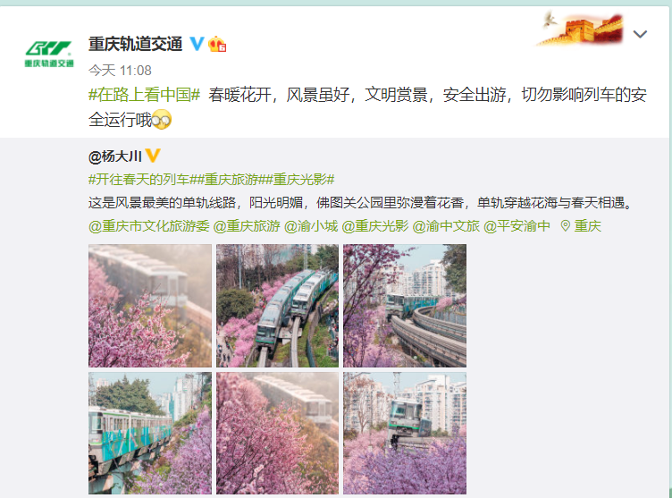 点击 连日来,重庆天气转暖 红梅、玉兰、海棠 山茶、美人梅等竞相开放 重庆标志性的单轨列车通体彩色涂装 一路穿越缤纷花海 如童话般美不胜收 22日 重庆轨道交通微信公众号发布消息 提醒游客欣赏美景的同时 一定注意安全 近日 一段“重庆网红列车遭无人机撞击逼停”的视频 在网络热传 据报道,2月22日15时30分左右,有“开往春天的列车”之称的重庆轨道交通2号线行驶至佛图关段至大坪段时,一架无人机超低空飞行逼停行驶中的列车。 列车停下一段时间后,重新正常运行至下一站。目前,无上报乘客受伤情况。重庆轨道交通公司已向相关部门上报该事件,待进一步处理。 22日 重庆轨道交通微信公众号发布消息 重庆轨道交通表示,根据《城市轨道交通运营管理规定(中华人民共和国交通运输部令2018年第8号)》第三十四条规定,禁止下列危害或者可能危害城市轨道交通运营安全的行为:在地面或者高架线路两侧各100米范围内升放风筝、气球等低空飘浮物体和无人机等低空飞行器。违者将依法追究相关责任。 单轨列车穿行在花海中 成为城市中一道亮丽的风景线 为拍到美景 很多人在轨道周围放飞无人机。 为此,重庆市公安局九龙坡区分局提醒,目前,重庆警方正着力整治轨道上空的无人机!请大家在欣赏美景的同时,注意自身的安全,不要影响轨道交通的安全运行。 风景虽美 拍照录像时 请一定要注意保持安全距离 切勿影响列车行车安全 其实重庆各地正是 百花盛开,美不胜收的时间 小编就为大家介绍下 重庆主城赏花攻略 成千上万株红梅连成海洋 肆意地在枝头绽放 仿佛要把整片天空的遮满才肯罢休 引来无数游客前来踏青 无论漫步于花海中踏青寻香 亦是脚踏自行车追寻暗香而去 都是这个春天最美的享受 摄图网:ID:501702238 地址:重庆市渝北区金开大道西段88号 自驾:导航搜索“渝北照母山森林公园” 公交:乘坐5号线在人和站下车,然后步行上山 中央公园的红梅花海如期绽放 大面积红梅惊艳上线 这里的红梅虽生在公园里 却丝毫不拘谨 在春风细雨中自由自在的生长 反而生出一股子野性 摄图网ID:500817307 地址:重庆市渝北区公园西路 自驾:导航搜索“重庆中央公园” 公交:乘坐10号线在中央公园东地铁站下车,然后步行 碧津公园里清纯又娇滴滴的红梅 以新绿粉嫩的花蕊点缀出动人的春色 徐徐传来的一阵阵清香沁人心脾 春风吹来 迎春花摆动着柔软的枝条 像在空中跳起欢快的舞蹈 摄图网ID:500815107 眼下,除了红梅花外 其它品种的迎春花卉也陆续进入了盛放期 碧津公园的整个春季赏花期 将持续到5月上旬 这段时间,都可以来到碧津公园赏花游园 地址:重庆市渝北区双龙大道31号 自驾:导航搜索“碧津公园” 公交:乘坐3号线在碧津地铁站下车,然后步行 要赏樱桃花 可以去渝北区玉峰山樱桃基地 果农在斜坡上成片种植樱桃树 结果的时候游客很多 开花的时候游客很少 很适合踏青赏花 摄图网ID:501208591 远远望去,漫山花儿汇集成白色的海洋 萦绕着错落有致的村舍 烂漫纯净 谱写出早春时节悦耳的旋律~ 不过,玉峰山的樱桃花花期只有半个月 大家要抓紧了哟~ 地址:重庆市渝北区玉峰山镇玉峰村 自驾:导航搜索“玉峰山樱桃基地” 彩云湖公园一年四季都有着不同的颜色 春天正是花开季节 园子里最多的就是樱花和红梅 摄图网ID:300441838 除此以外 还有潺潺的溪流、碧波荡漾的池塘 和无忧无虑的鱼儿 成群的白鹭和苍鹭时而掠过水面 是难得的休闲之地 此时的彩云湖便被装扮得粉嫩粉嫩的 这样的景色简直让人心旷神怡 地址:重庆市九龙坡区和高新区交界处蟠龙大道 自驾:导航搜索“彩云湖湿地公园” 公交:乘坐环线在彩云湖站下车 春意盎然二月天 正值樱花烂漫时 闻着春的气息南山植物园的樱花悄然绽放 摄图网ID:501046176 临近三月,天气还有些微凉 朵朵 早春樱花 凌空绽放 黛粉的花瓣点缀在枝头 树枝摇曳,娇艳欲滴 地址:重庆市南岸区南山公园路101号 自驾:导航搜索“重庆南山植物园” 公交:乘坐公交车384路(南山方向)到南山站下车,然后步行 关注【重庆本地宝】公众号 在微信对话框输入并发送【赏花】或【草莓】 即可获取 重庆最新赏花攻略、草莓采摘地 趁着春色正好 -END- 右下角,您点一个赞和在看 小编工资涨1毛 小编有话说 重庆本地宝办事易 符合条件即可免费报名学习 (条件:无工作,无职工社保) 不需要缴纳任何费用 不仅免费学习拿证,还能学习母婴知识 抓紧扫描识别下方二维码 ↓添加本地宝老师进行报名吧↓ ▌说明:本文由重庆本地宝编辑整理发布,转载请注明;我们尊重版权,如有侵权请联系删除 ▌来源:重庆本地宝整理重庆共青团、重庆发布、重庆等;文章、封面图片来源图虫网、摄图网(已获平台授权) ▌编辑:泡菜 ▌商务合作:电话:400-9999-087 QQ:4009999087 注:手机QQ添加时,若无法找到,请选择“找公众号”即可添加 ▼点击“阅读原文”,即可查询重庆最新隔离政策 点分享 点点赞 点在看蓝字关注 回复“隔离”获取重庆最新隔离/核酸政策