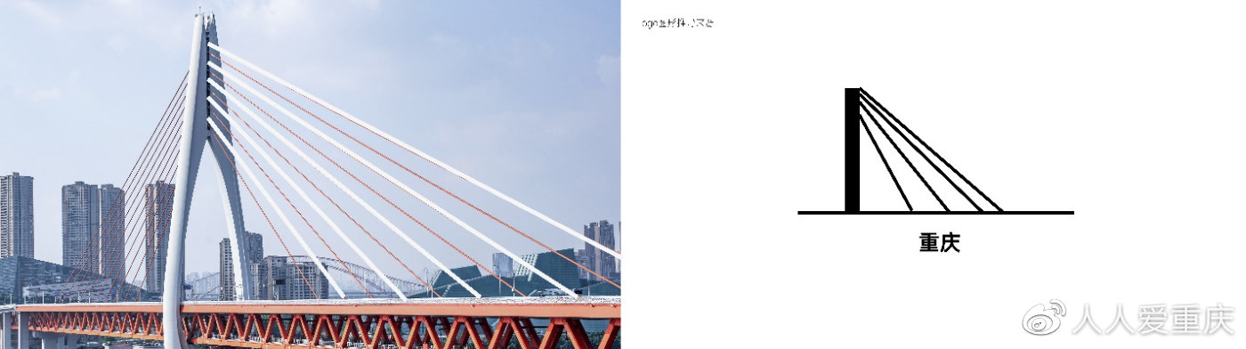 第一个“M”形元素是桥都重庆的象形意释。在重庆直辖市内有过万座桥梁,横跨在长江和嘉陵江上的特大桥也有数十座, 在桥梁数量、建造规模、以及桥梁多样化上都名列中国之首, 实至名归。重庆遇水架桥,代表了不断前进奋斗、不断拼搏创造的精神,桥的两端象征着连接着过去与未来。