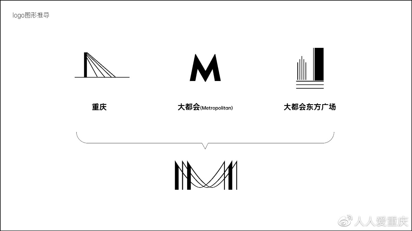 三个“M”形元素通过简约的流动线条融合成Logo的主体, 桥都重庆以国际大都会为核心连接着大都会东方广场,共同以拼搏前进的精神,从桥的一端传承经典传奇的过去,连接到另一端辉煌的未来。重庆,就是一个大都会!