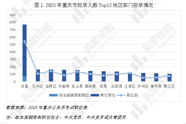 2023年重庆市公务员考试中,市直机关本次招录人数、职位数领先其它地区部门,共有公务员职位541个,合计招录771人。其次是万州区、涪陵区,两地招录人数较去年上涨幅度均超40%,2023年两地招录仅相差2人。本次省考政治面貌限制职位占比为6%,36%的政治面貌限制职位来自市直机关。