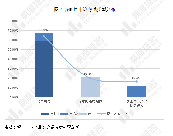 重庆市公务员考试类型分为以下情况,考行政执法类职位申论考试类型为“申论3”,艰苦边远地区基层职位申论考试类型为“申论2”,普通职位申论考试类型以“申论1”为主,即通用卷;考试类型为“申论1”的普通职位中,有437个职位需通过专业科目考试(专业能力测试)。今年约59.5%的职位申论考通用卷,招录人数占比约57%。