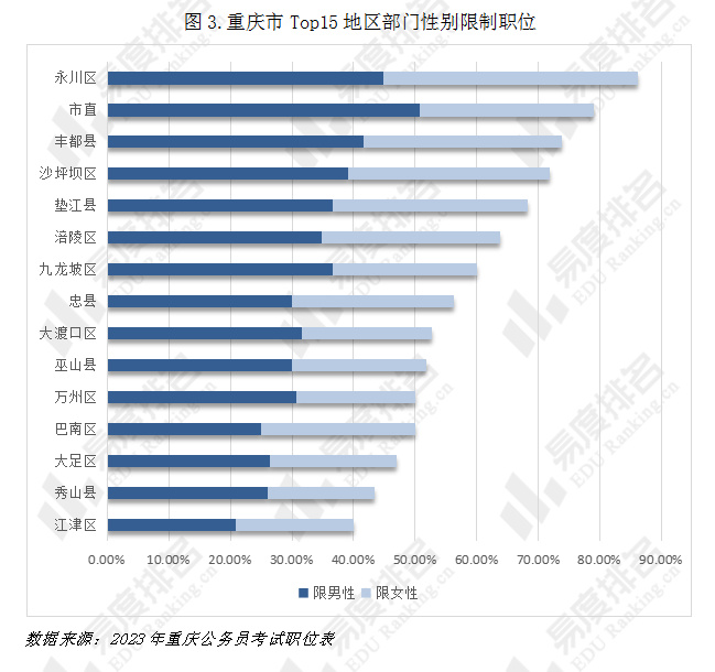 2023年重庆公务员考试各地区部门招录职位中约47%的职位限制了招录性别。重庆市多数地区部门限定性别职位并无明显偏好,限定男性和女性的职位占比差距较小,性别限制职位占比较高的地区为永川区,其次为市直机关。市直机关限男性报考职位占比超50%,限女性报考职位占比达28%,市直机关更倾向招录男性。