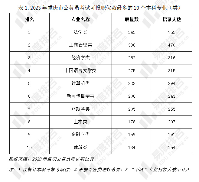 在此次重庆市公务员考试中,本科学历可报考的不限专业职位约有613个(合计招录896人),法学类、工商管理类专业在公务员考试中可报职位数与招录人数较多。