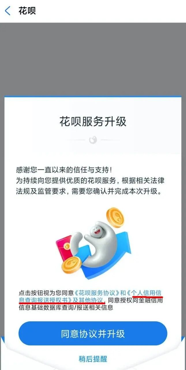 从6月开始,一些花呗用户陆续收到了花呗服务升级的通知,内容显示为:为持续向您提供优质的花呗服务,根据相关法律法规及监管要求,需要确认完成本次升级。其中,征信报送的授权书就在此次升级服务的内容中。