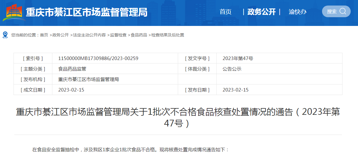 重庆市綦江区市场监督管理局关于1批次不合格食品核查处置情况的通告(2023年第47号)