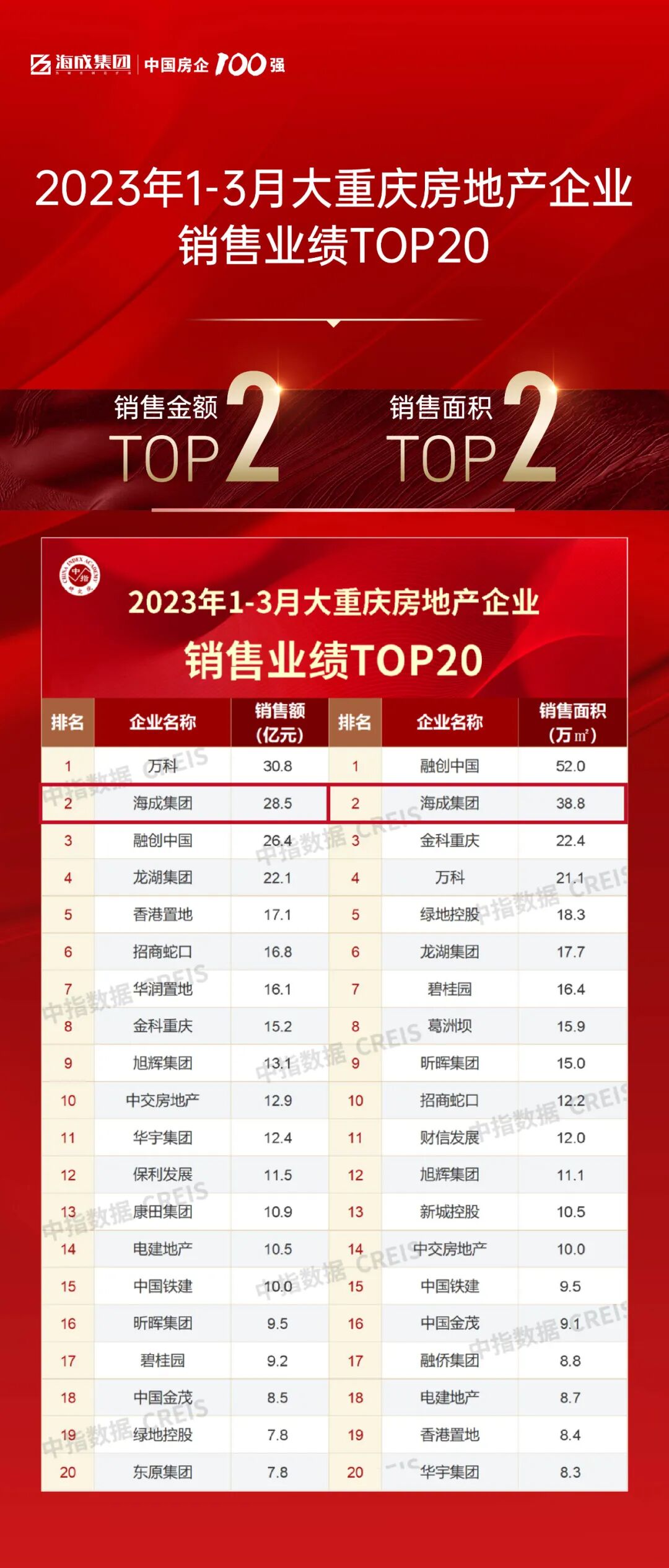在中指研究院最新数据中,海成集团以28.5亿元的销售额,位列1-3月大重庆房地产企业销售业绩榜TOP2;以38.8万㎡的销售面积,位列1-3月大重庆房地产企业销售业绩榜TOP2。