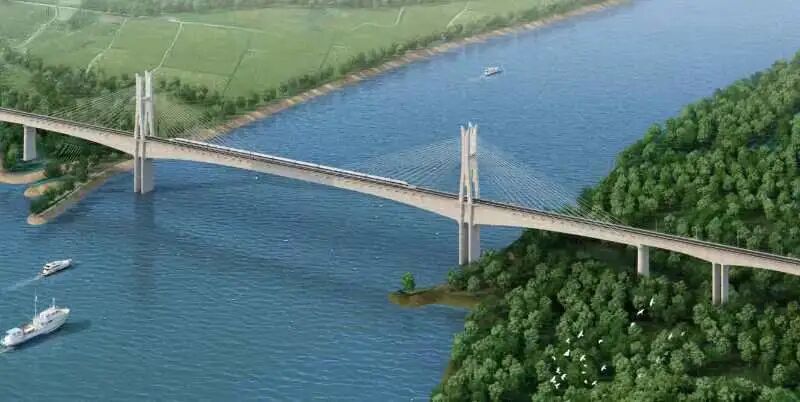 成达万高铁全线共有4座矮塔斜拉桥,其中嘉陵江特大桥是全线控制性工程,也是全线施工难度最大的桥梁,由四川路桥集团承建。该桥位于南充市顺庆区搬罾街道和高坪区龙门街道之间,横跨嘉陵江,大桥全长6224.98m,主桥为(141+328+141)m矮塔钢混合梁斜拉桥,主跨328米,在时速350公里双线高速铁路矮塔斜拉桥中,其跨度居世界第一。