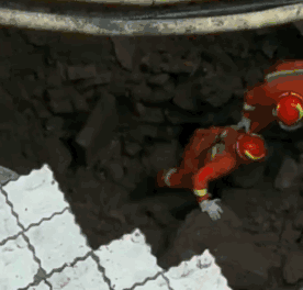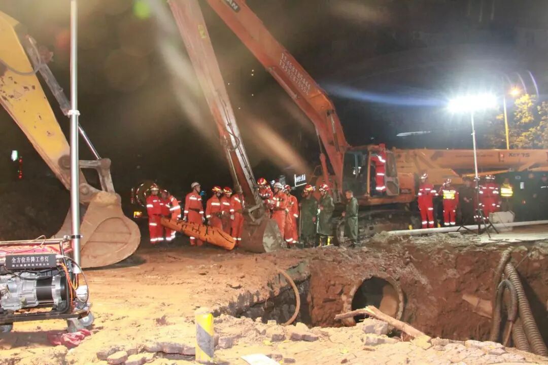 在救援过程中,塌陷区发生了二次坍塌,又下沉了两米,消防员在救援过程中立即疏散,警戒用保险绳把他们拉起来了。记者在现场看到,在现场救援过程中,塌陷区四壁的沙石不时在滚落,消防官兵只能是采取机械和手刨、土工作业交替配合的方式抢救被困人员,边救援边警戒以保护自身安全。