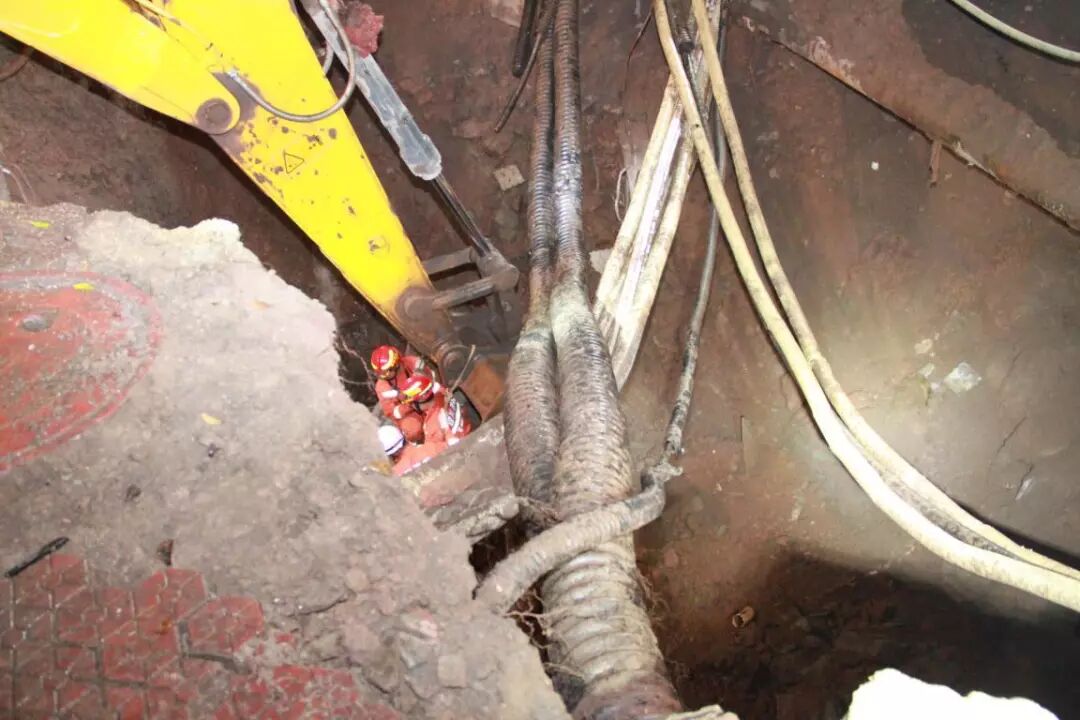 救援的难度不止于此。记者在现场看到,塌陷区地下管网错综复杂。高明月介绍,这给救援工作带来了很大的难度。从挖出的情况看,管线包括了2根高压线(已断电),还有天然气管道、若干弱电管道,两条呈十字型交叉的排污管道早前作业时已取掉。记者在现场看到,为了方便作业,除燃气管道外,其余线网已由吊车吊起悬于塌陷区上方。