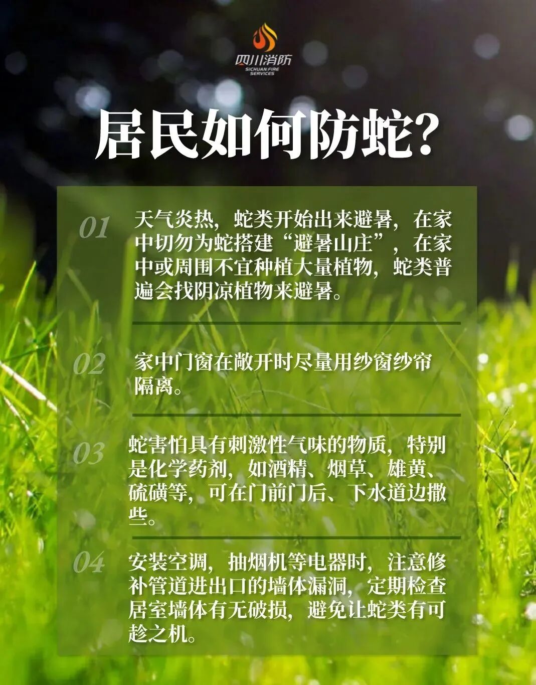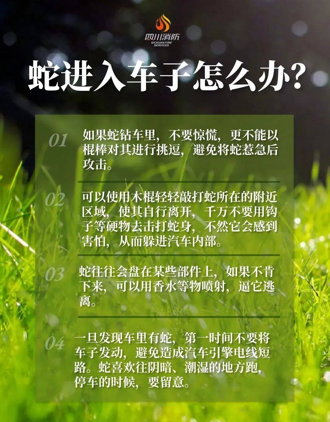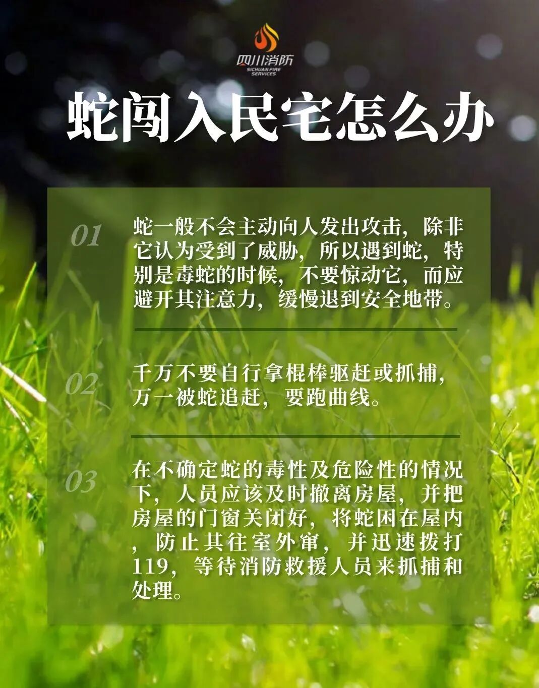 未来一周 阳光将成为当仁不让的主角 最高气温将升至29℃ 阳光明媚,春意盎然 正是踏青好时节 不仅是人们想要外出踏青 一些小动物也逐渐 从冬眠中醒过来外出觅食 小心“蛇出没” 这不 一些群众的家中 就迎来了一些“不速之客” 3月27日 攀枝花市米易县青皮村 一农户家中有蛇出没 消防员搜查后在木板下发现并抓捕 4月3日 凉山州会东县一户人家的 杂物间发现一条蛇 消防救援人员利用捕蛇器 对蛇实施抓捕 随后将蛇放入事先准备好的捕蛇袋中 在安全地点将其放生 4月5日 凉山州西昌市川兴镇 一农户家有蛇“来访” 消防员到达现场后快速搜索 发现两条菜花蛇藏匿在墙角物架下 消防员立即使用捕蛇钳将其捕获 4月3日 眉山市东坡区一单位库房内 发现有蛇的踪迹 消防救援人员在做好安全防护后 利用捕蛇器对其进行抓捕 4月5日 自贡市自流井区一商铺 发现蛇的踪迹 消防员到场后就擒住了这条小蛇 根据“蛇警”信息发现 蛇出没的地方五花八门 比如下水道、储藏室、垃圾堆 和草丛等阴暗潮湿的地方 如何防范蛇出没 一份防蛇指南请收藏 防 蛇 指 南 左右滑动查看更多 川川提醒 居民平时应关好自家门窗 防止蛇类等爬行动物进入室内 如果发现有异常情况不要惊慌 不要擅自处置 可及时拨打119求助 四川消防“查”“宣”结合,筑牢清明期间消防安全线 来源:自贡消防、攀枝花消防、眉山消防、凉山消防 编辑:杜颖 校对:黄宇 责编:吴梦影 审核:魏庆 记得点赞和在看哦