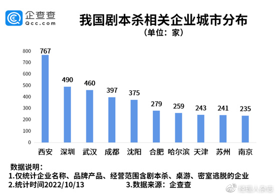 企查查数据显示,从城市分布来看,西安以767家剧本杀相关企业排名第一。深圳、武汉分别有剧本杀相关企业490家、460家,排名前三。此后依次为成都、沈阳、合肥等城市。