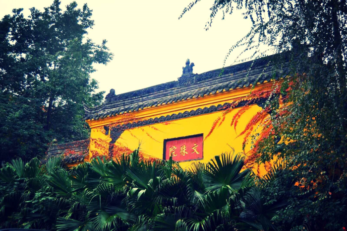 走近寺前,只见古色厚朴的围墙盘绕在古刹四周,正门上嵌着“文殊院”三个大字,与围墙上“南无阿弥陀佛”、“庄严国土、利乐有情”、“世界和平、人类幸福”相映衬,使文殊院显得十分庄严、肃穆。