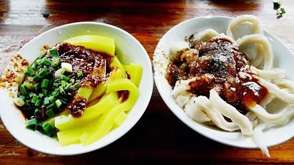 来这的吃货们多是会点上一碗甜水面加一碗凉粉。尤其是甜水面,面条又粗,又长,又有嚼劲。