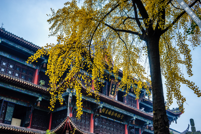 五重大殿连同前后照壁,分布在长200米的中轴线上,各殿堂楼阁古朴宏敞,飞檐翘角,是典型的清代建筑。殿堂之间,主次分明,错落有致,疏密得体,大小相同,院中有园,园中有院,院中有景,环境极是清静幽雅。又前临文殊院街,后畔万福桥侧,素有“寺殿接通衢,禅房远尘嚣”之说。