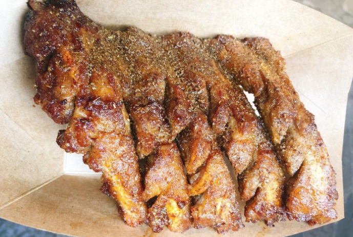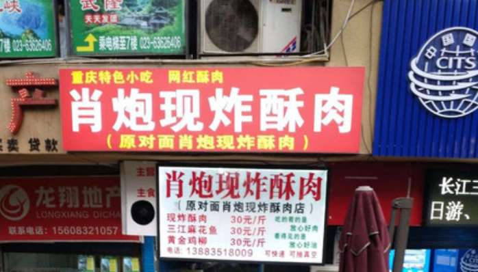 2、皇烤火排骨 地址:磁器口小西门203号 老板烤起来特别认真,不光外面都烤的酥脆了,还把每一根肋条剪开把剪开的两侧一并烤的焦焦嫩嫩。烤的时候滋滋响,特别香,先煮后烤很入味!不断地撒上孜然和辣椒粉,让口感更好。肉也非常嫩,还会有汁水~真的超好吃