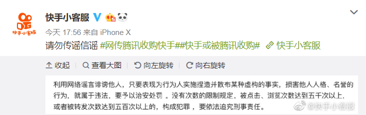 :是时候转发到家庭群给长辈们看看了。#快手回应 “ 被腾讯收购 ” : 请勿信谣传谣