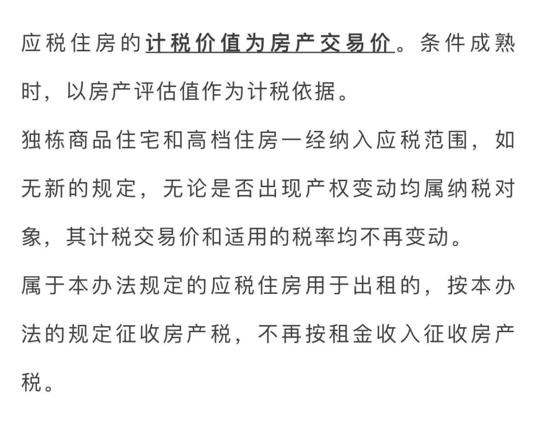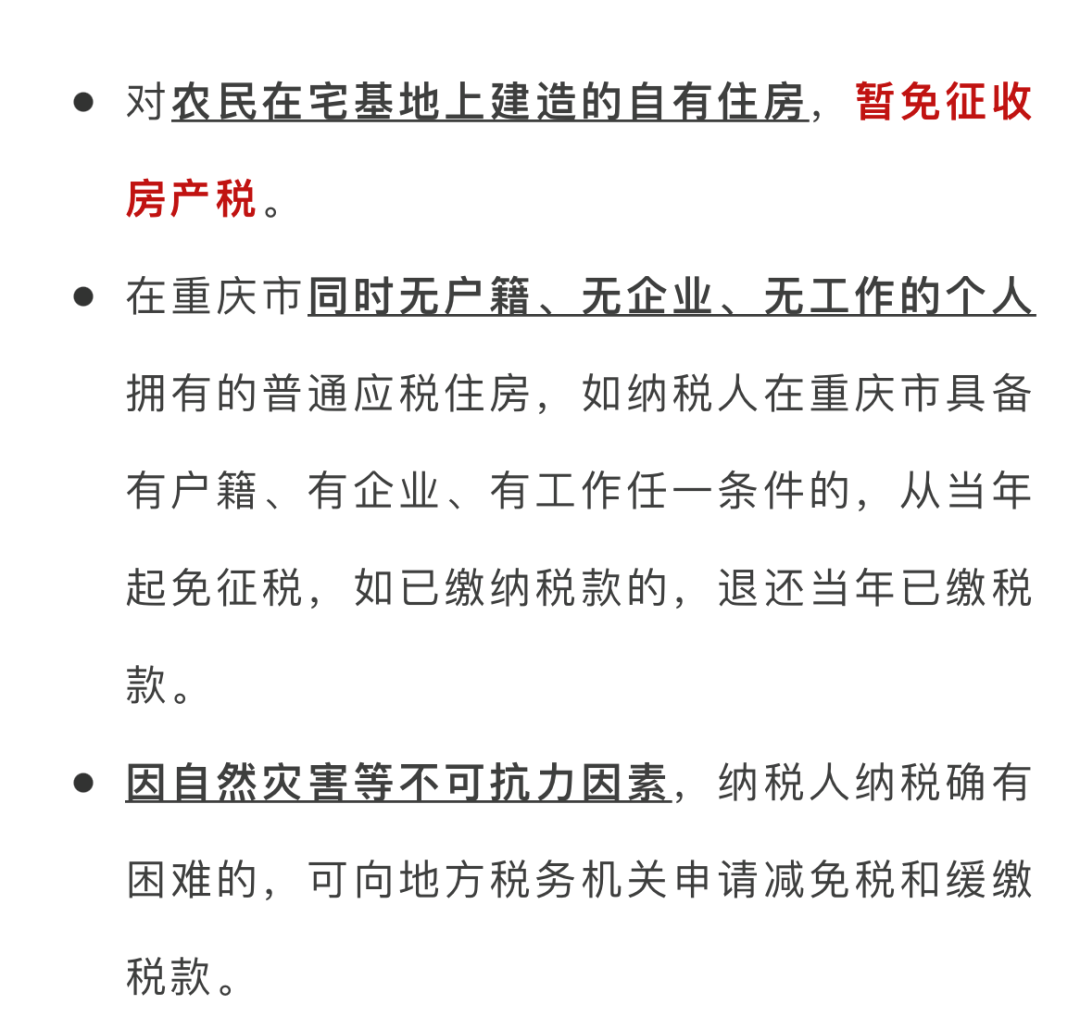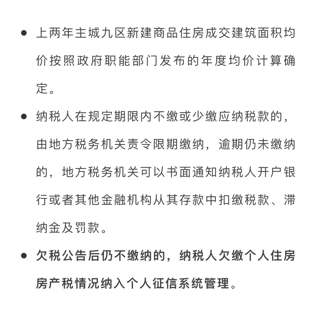 点击 2021年12月31日 重庆市住房和城乡建设委员会 发布公告 图源:重庆市住房和城乡建设委员会 2020—2021年中心城区新建商品住房 成交建面均价的2倍为25820元/平方米 落款时间为2022年1月1日 这意味着2022年重庆市对 个人新购的高档住房征收房产税 起征点为25820元/平方米 税线比去年上涨了3714元 2019年:17630元/平方米 2020年:19587元/平方米 2021年:22106元/平方米 有哪些房子属于征收范围? 税率是多少? 应纳税额应该如何计算呢? ↓↓↓ 按照自2017年1月14日起施行的《重庆市人民政府关于修订<重庆市关于开展对部分个人住房征收房产税改革试点的暂行办法>和<重庆市个人住房房产税征收管理实施细则>的决定》: 为调节收入分配,引导个人合理住房消费,根据国务院第136次常务会议有关精神,重庆市人民政府决定在部分区域开展对部分个人住房征收房产税改革试点。 试点区域为渝中区、江北区、沙坪坝区、九龙坡区、大渡口区、南岸区、北碚区、渝北区、巴南区(以下简称主城九区)。 一、试点采取分步实施的方式。首批纳入征收对象的住房为:1.个人拥有的独栋商品住宅。2.个人新购的高档住房。(高档住房是指建筑面积交易单价达到上两年主城九区新建商品住房成交建筑面积均价2倍(含2倍)以上的住房)3.在重庆市同时无户籍、无企业、无工作的个人新购的首套及以上的普通住房。 注:新购住房是指《暂行办法》施行之日起(2017年1月14日起施行)购买的住房(包括新建商品住房和存量住房)。新建商品住房购买时间以签订购房合同并提交房屋所在地房地产交易与权属登记中心的时间为准,存量住房购买时间以办理房屋权属转移、变更登记手续时间为准。 二、未列入征税范围的个人高档住房、多套普通住房,将适时纳入征税范围。 摄图网ID:500599550 纳税人为应税住房产权所有人 产权人为未成年人的,由其法定监护人纳税。 产权出典的,由承典人纳税。 产权所有人、监护人、承典人不在房产所在地的,或者产权未确定及租典纠纷未解决的,由代管人或使用人纳税。 应税住房产权共有的,共有人应主动约定纳税人,未约定的,由税务机关指定纳税人。 摄图网ID:501056023 摄图网ID:500724782 一、独栋商品住宅和高档住房建筑面积交易单价在上两年主城九区新建商品住房成交建筑面积均价3倍以下的住房,税率为0.5%;3倍(含3倍)至4倍的,税率为1%;4倍(含4倍)以上的税率为1.2%。二、在重庆市同时无户籍、无企业、无工作的个人新购首套及以上的普通住房,税率为0.5%。 摄图网ID:500455438 一、个人住房房产税应纳税额的计算: 应纳税额=应税建筑面积×建筑面积交易单价×税率应税建筑面积是指纳税人应税住房的建筑面积扣除免税面积后的面积。 二、免税面积的计算:扣除免税面积以家庭为单位,一个家庭只能对一套应税住房扣除免税面积。 纳税人在本办法施行前(2017年1月14日起施行)拥有的独栋商品住宅,免税面积为180平方米; 新购的独栋商品住宅、高档住房,免税面积为100平方米。 纳税人家庭拥有多套新购应税住房的,按时间顺序对先购的应税住房计算扣除免税面积。 在重庆市同时无户籍、无企业、无工作的个人的应税住房均不扣除免税面积。 摄图网ID:500718116 个人住房房产税收入全部用于公共租赁房的建设和维护。 关注“重庆本地宝” 进入微信对话框 输入【购房】即可获取 重庆购房政策查询等相关信息 -END- (元旦快乐) 回复【九价】获取重庆九价疫苗最新消息 回复【居民医保】获取重庆居民医保缴费消息 回复【元旦】获取重庆元旦好玩好耍活动推荐 回复【元旦出行】获取重庆元旦限行、交通管制 回复【进重庆】获取进出重庆是否要隔离及核酸 回复【加强针】获取加强针到苗消息(每天更) ▌声明:本文由重庆本地宝编辑整理发布,转载请注明 ▌素材来源:重庆市人民政府、重庆市住房和城乡建设委员会、重庆本地宝整理发布 ▌图片来源:图虫网、摄图网(已获授权)、 ▌编辑:欠费 ▌关于版权:重庆本地宝尊重版权,如有侵权,请联系删除 ▌商务合作:电话 400-9999-087 QQ 4009999087 ▼点击“阅读原文”,即可获取重庆最新景点优惠!蓝字关注 回复“进重庆”获取最新防控政策