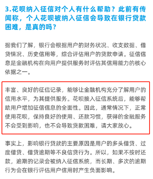 但根据媒体的报道,多家金融机构表示,正常使用花呗、保持良好还款习惯,不会对贷款造成影响。