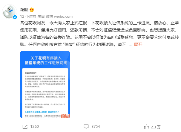 今天,花呗公告了接入征信工作的最新进展,花呗接入人民银行征信系统的安排已全面落地。