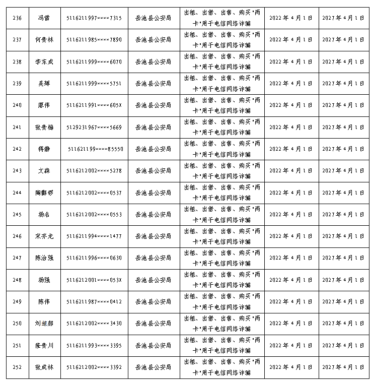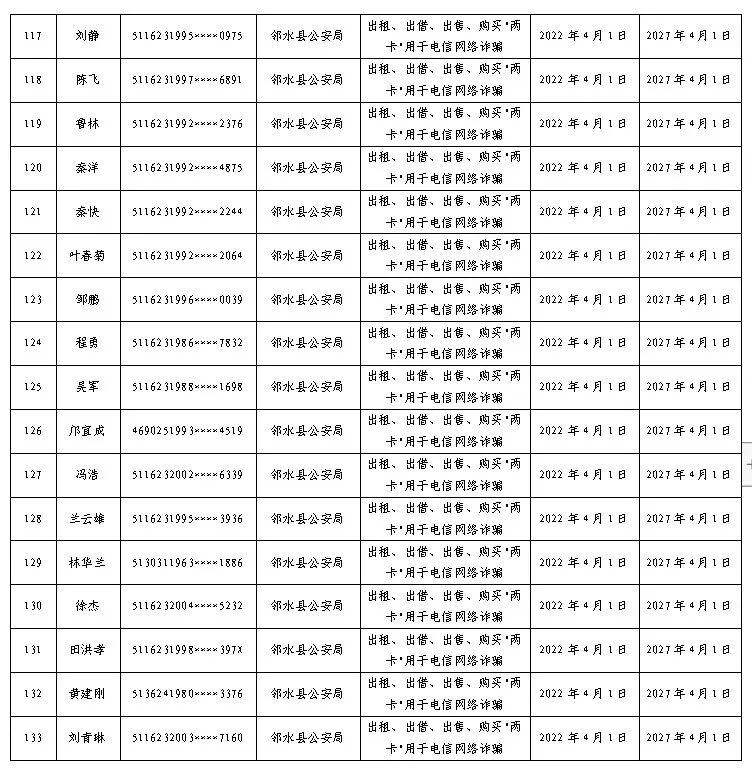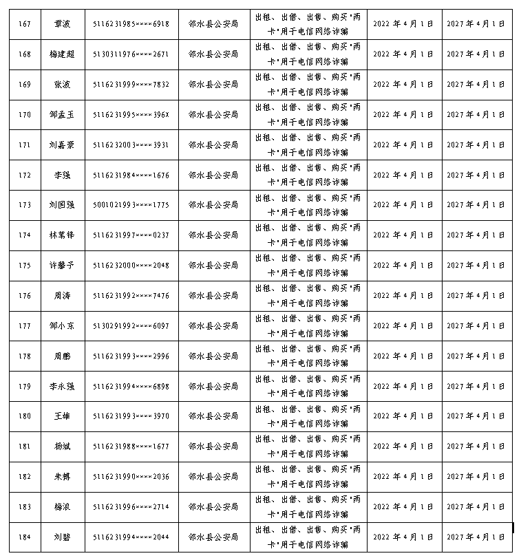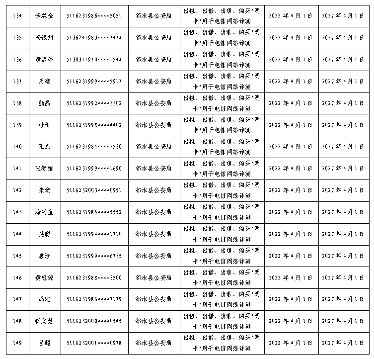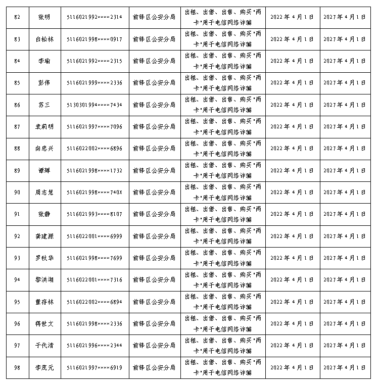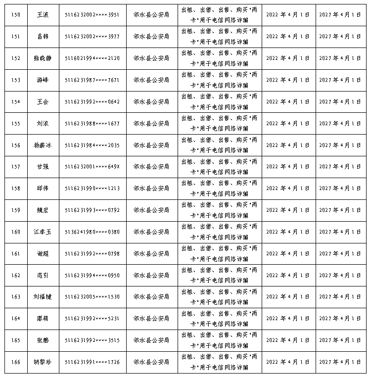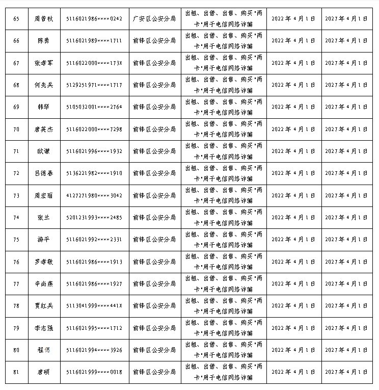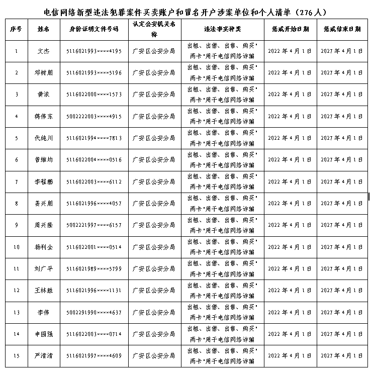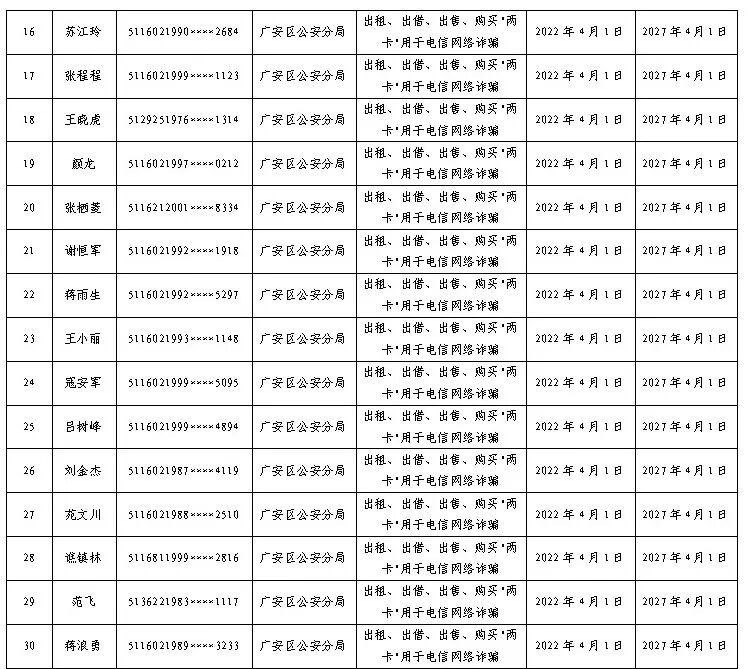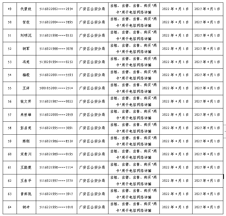 广安市2022年第一批“两卡”违法失信人员公开惩戒名单