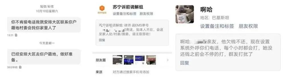 孙乒同样因疫情原因在苏宁任性花上逾期了2千元左右,逾期第三天起,自己和通讯录好友频繁被发消息骚扰、打电话威胁,而且态度越来越恶劣。