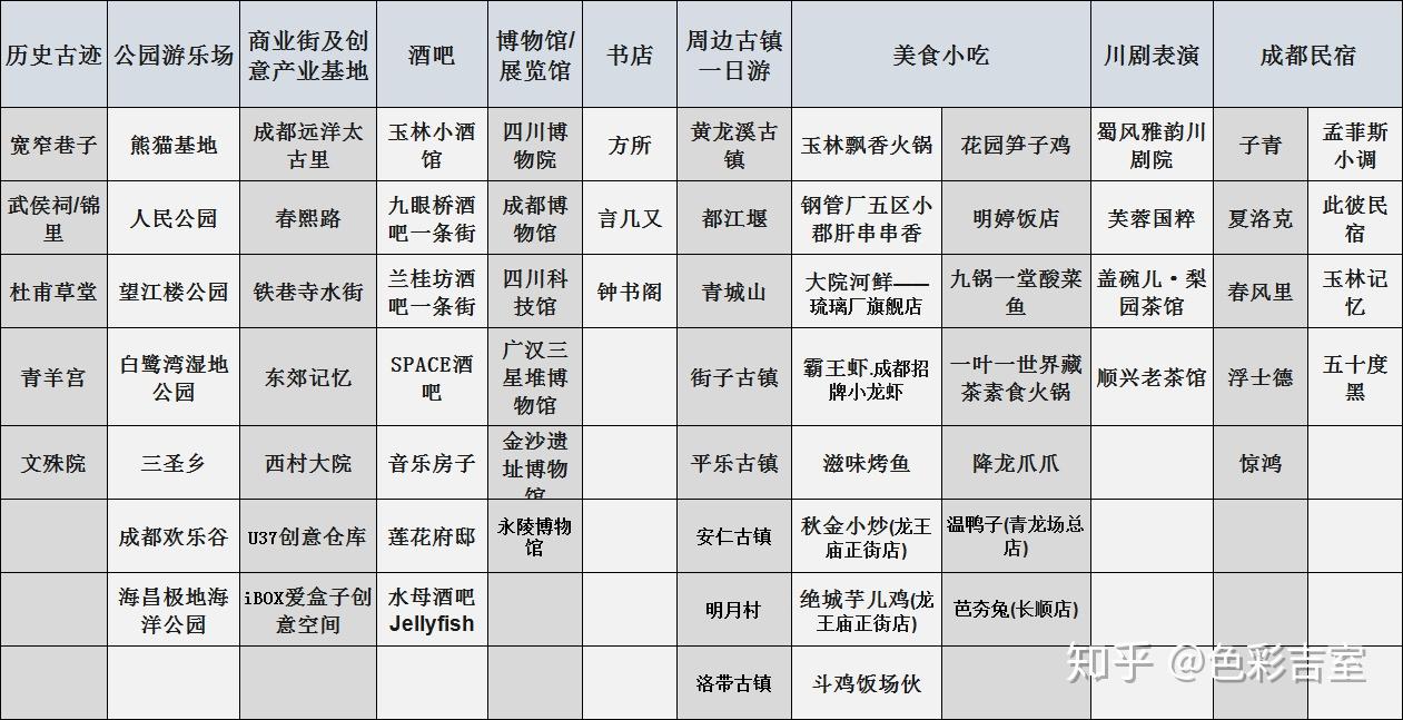 1.历史古迹推荐 2.公园游乐场推荐 3.商业街及创意产业基地推荐 4.酒吧推荐 5.博物馆/展览馆推荐 6.书店推荐 7.周边古镇一日游推荐 8.美食小吃推荐 9.川剧表演推荐 10.成都民宿推荐
